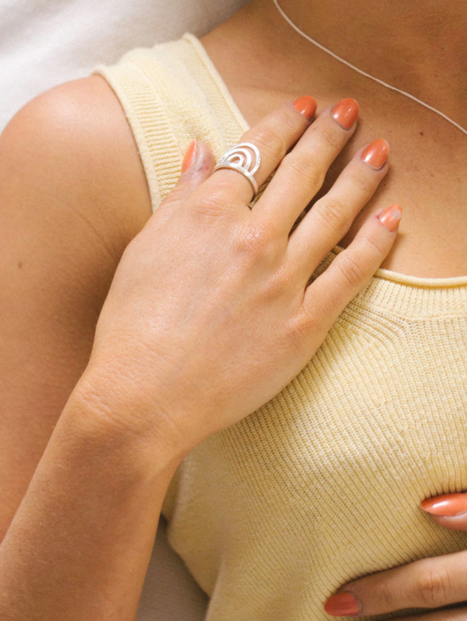 Each piece showcases the beauty of simplicity and organic shapes, crafted with meticulous care to evoke a connection to the earth. Featuring diverse textures and forms, from polished surfaces like afternoon glass-offs to intricate patterns mimicking waves and wind, every detail is thoughtfully considered. With pieces in gold vermeil radiating a subtle glow and others in recycled sterling silver, Pacific embodies sustainability and ethical practices.