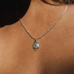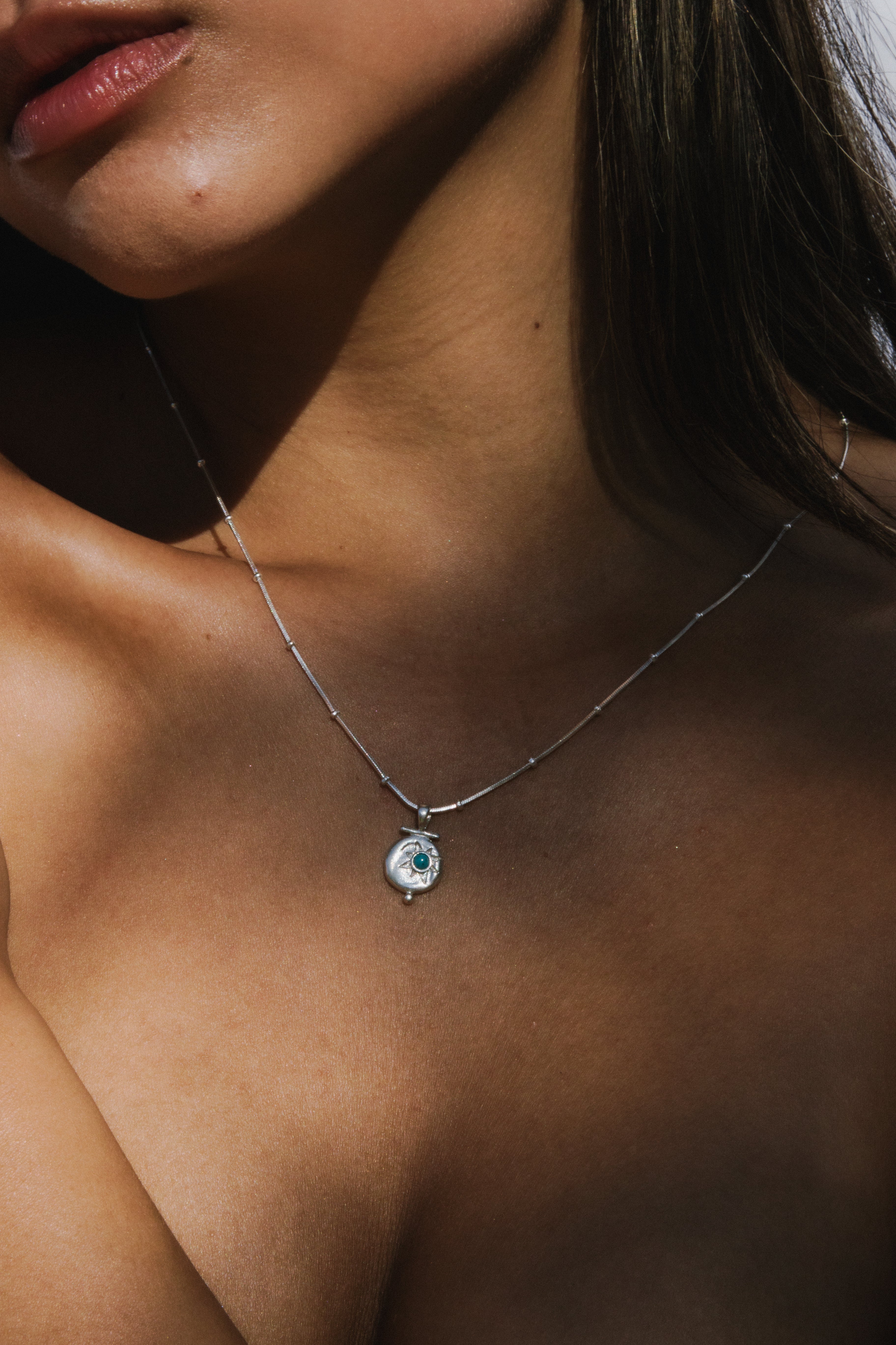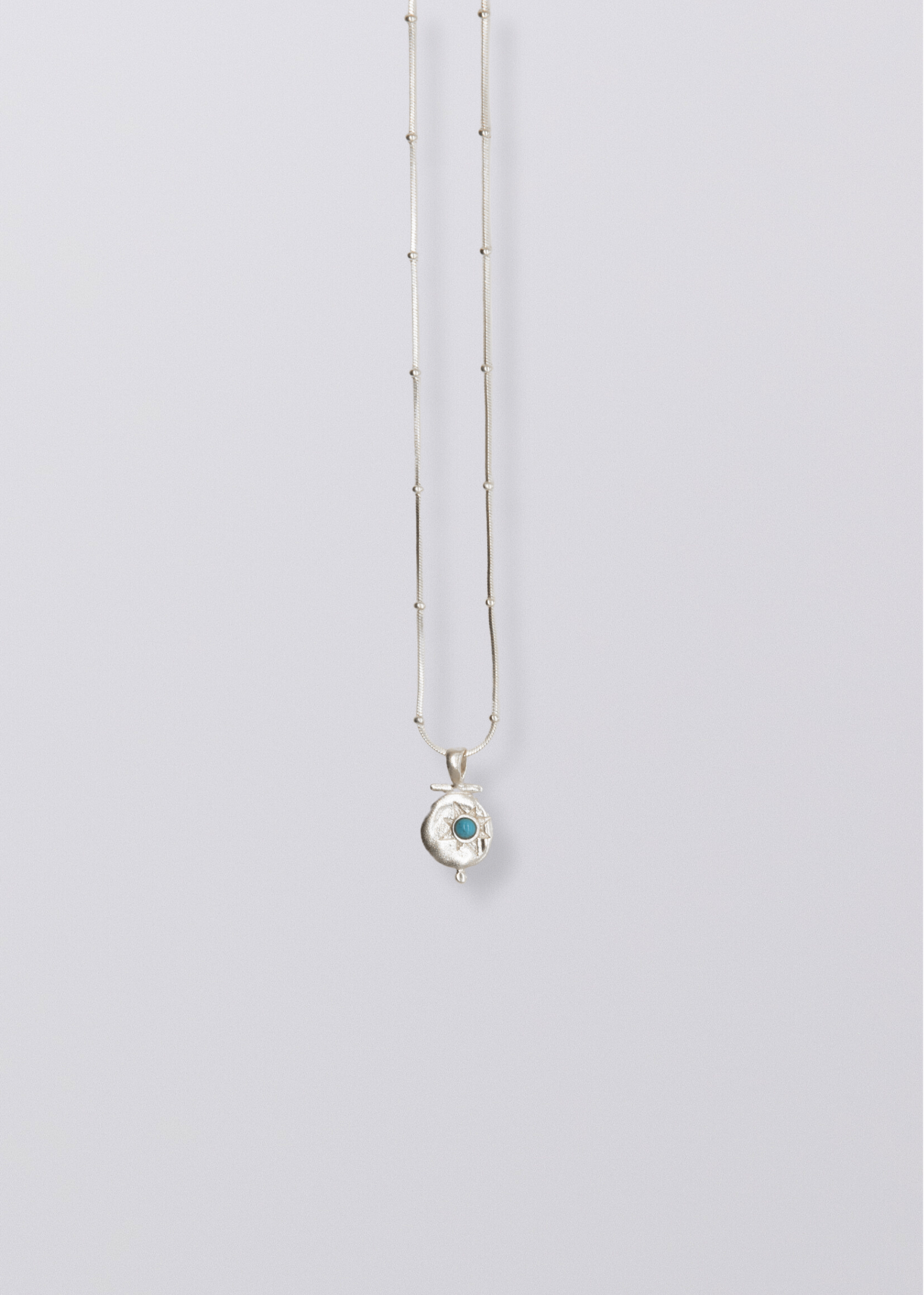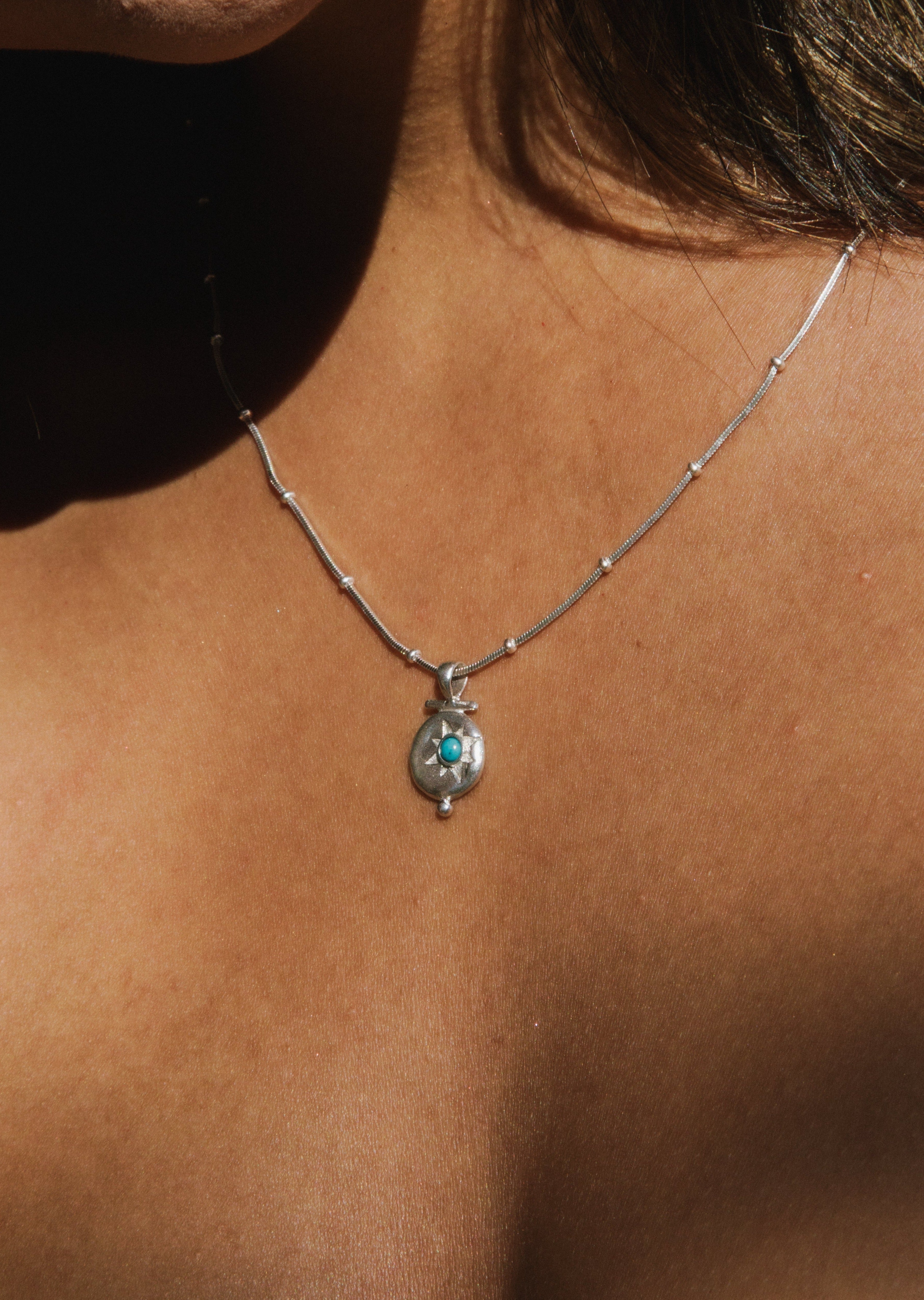 Introducing "Azure Necklace" a captivating necklace that effortlessly blends elegance with bohemian charm. Adorned with a delicately etched sun design, this dainty piece features a small turquoise stone at its centre, adding a pop of colour and mystique. The finishing touch is a timeless ball chain that adds a subtle sophistication