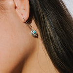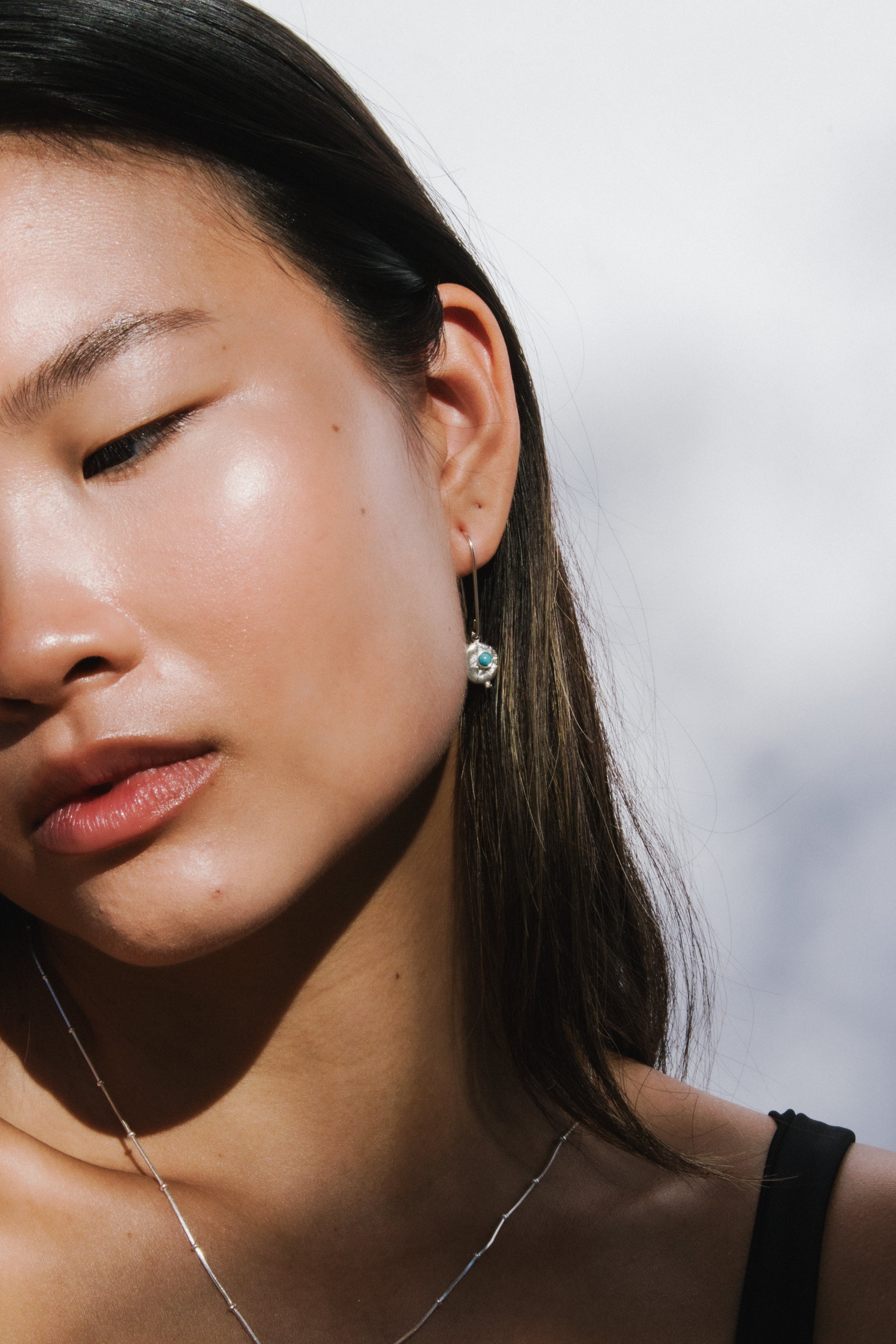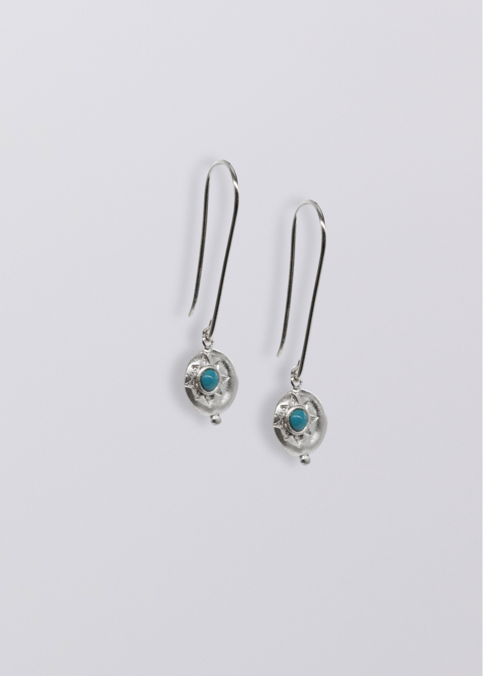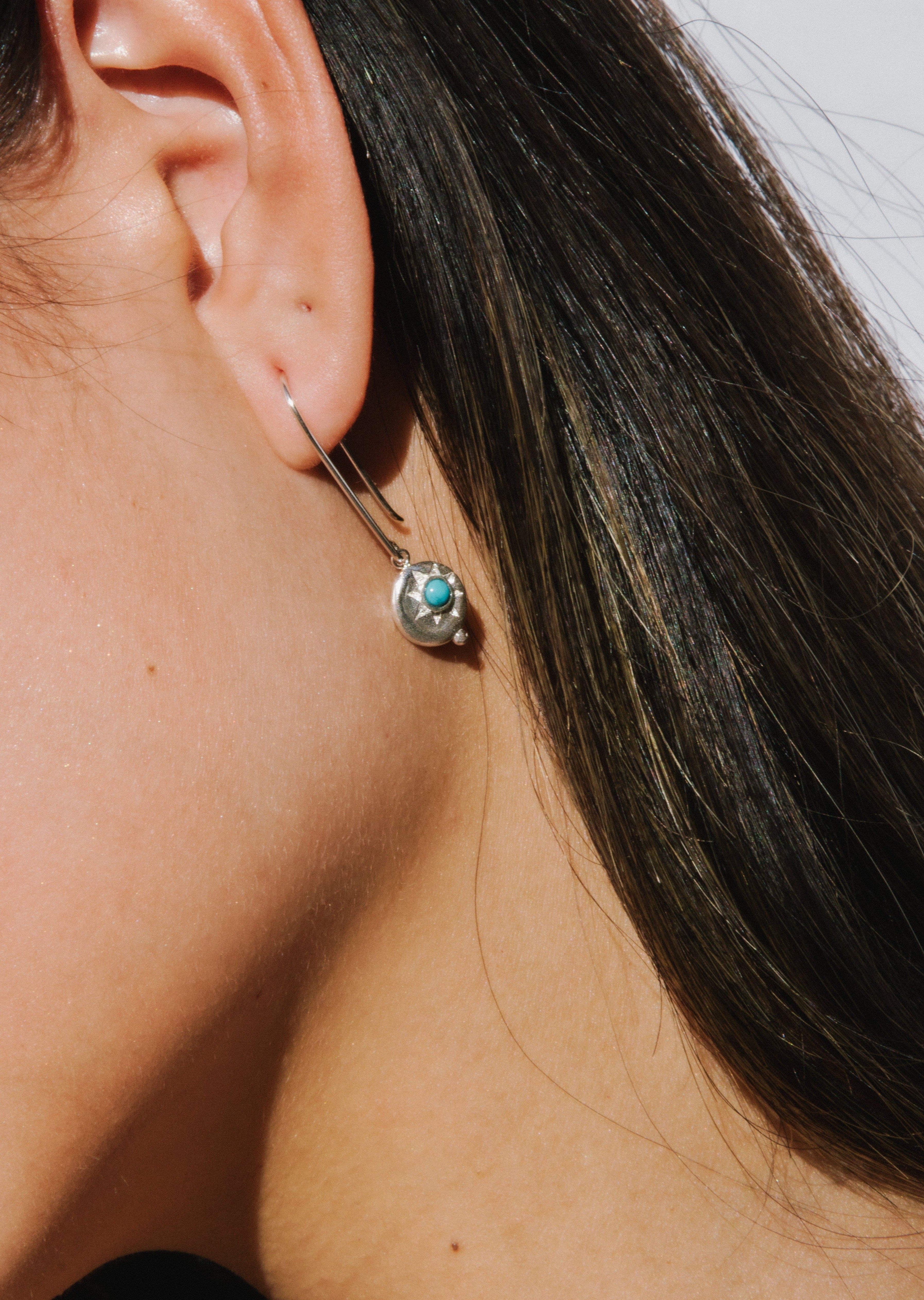 A bohemian dream that effortlessly merges timeless elegance with earthy charm. Adorned with a small etched sun design and a mesmerizing turquoise stone, these earrings exude laid-back sophistication. Pair with the Azure Necklace for a chic paired look.