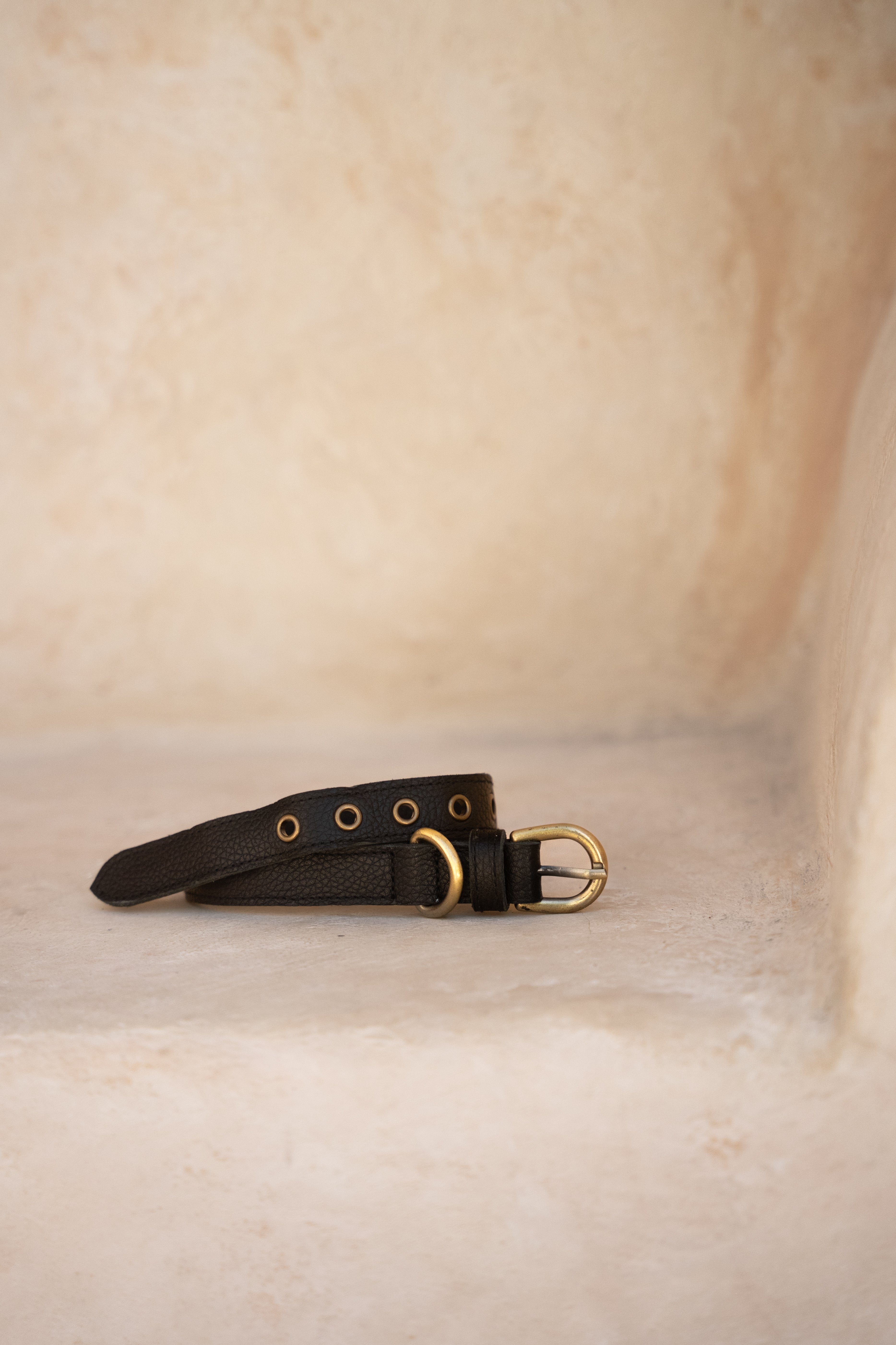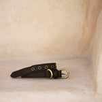 A soft leather collar with brass details, sturdy without the compromise of comfort for your fury friend. Featuring 5 collar holes to cater to most sized pups. H+H logo and size hand embossed on the inside of collar.