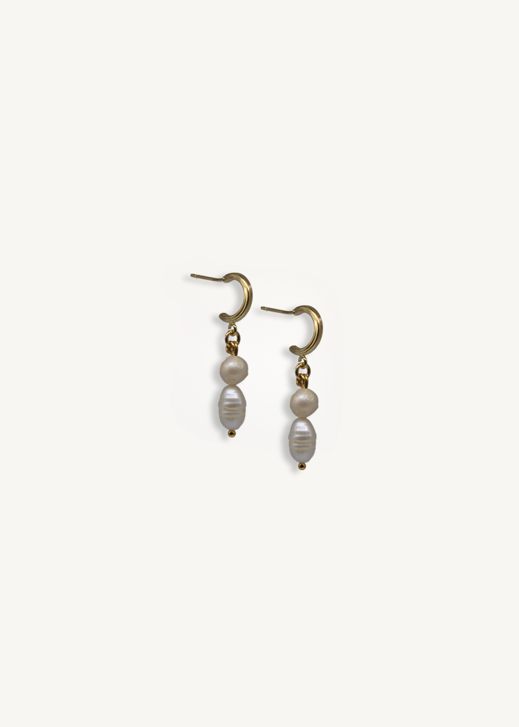 Double Pearl Drop Mini Hoops feature a small, dainty hoop with two irregular, organic pearls dropping from the hoop.