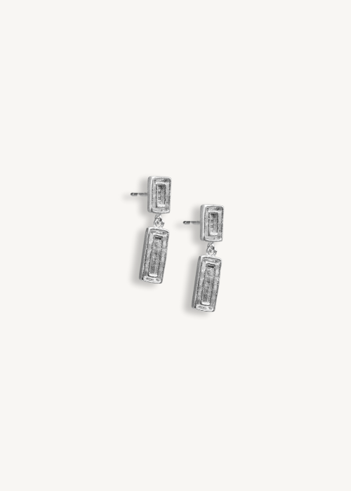The Dune Drops embody the raw beauty of sunlit shores and windswept sand dunes. These rectangular studs feature a textured surface reminiscent of shifting sands, weathered by time and tide. They feature two rectangle pendants, one that sits on the earlobe and the other drops delicately bringing subtle movement to the piece. The Dune capsule celebrates the allure of coastal landscapes, perfect for those who feel at home by the sea.