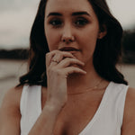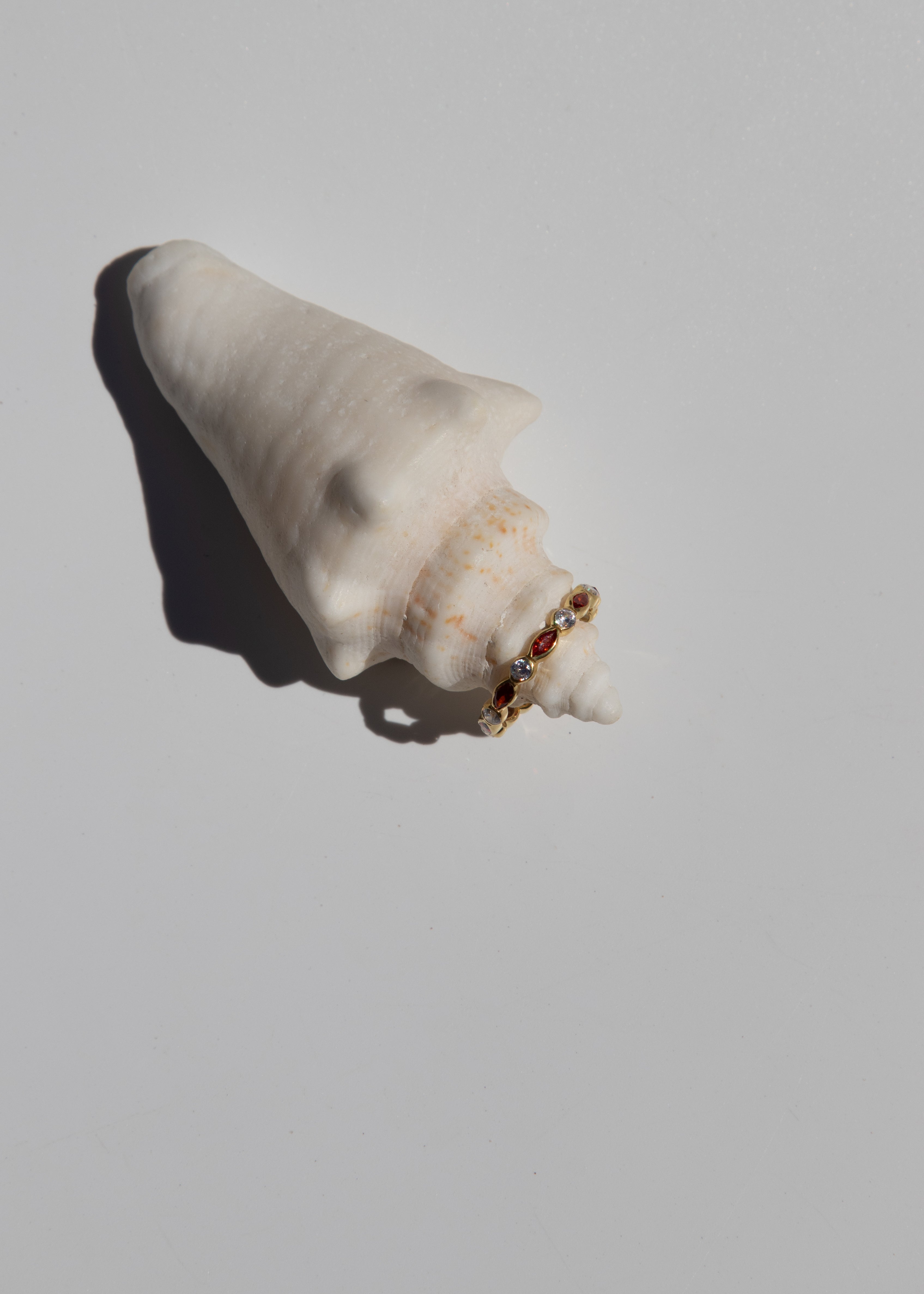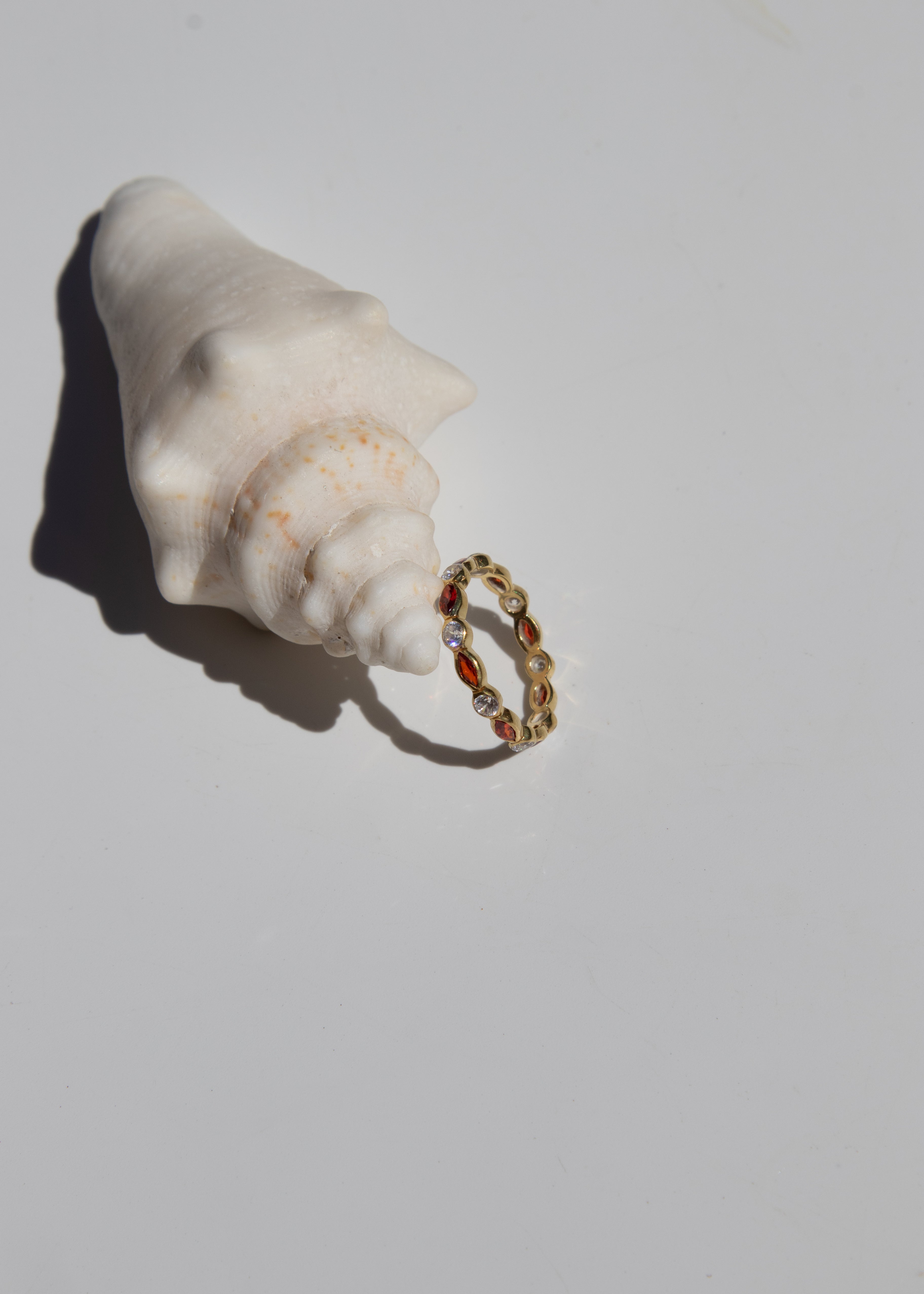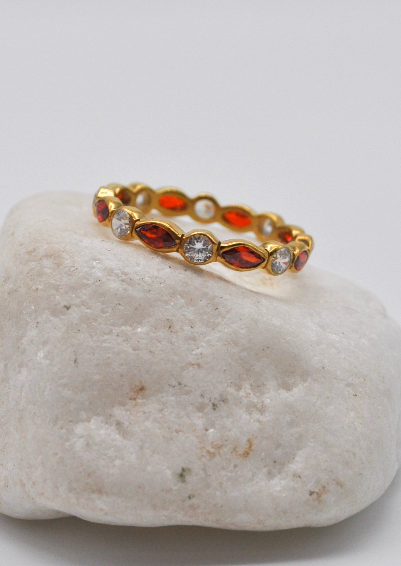 An eternity ring set with 16 shimmering Zircon, alternating between clear and garnet hue, set into 18ct Plated Gold. The high lustre, refractive indices, and dispersion of Zircon give this beauty all the sparkle you need.