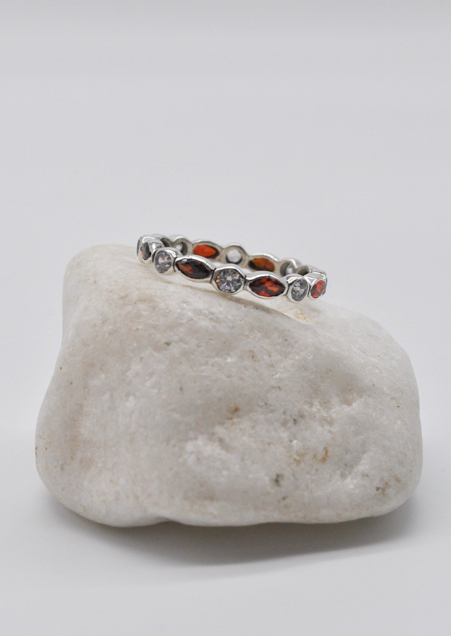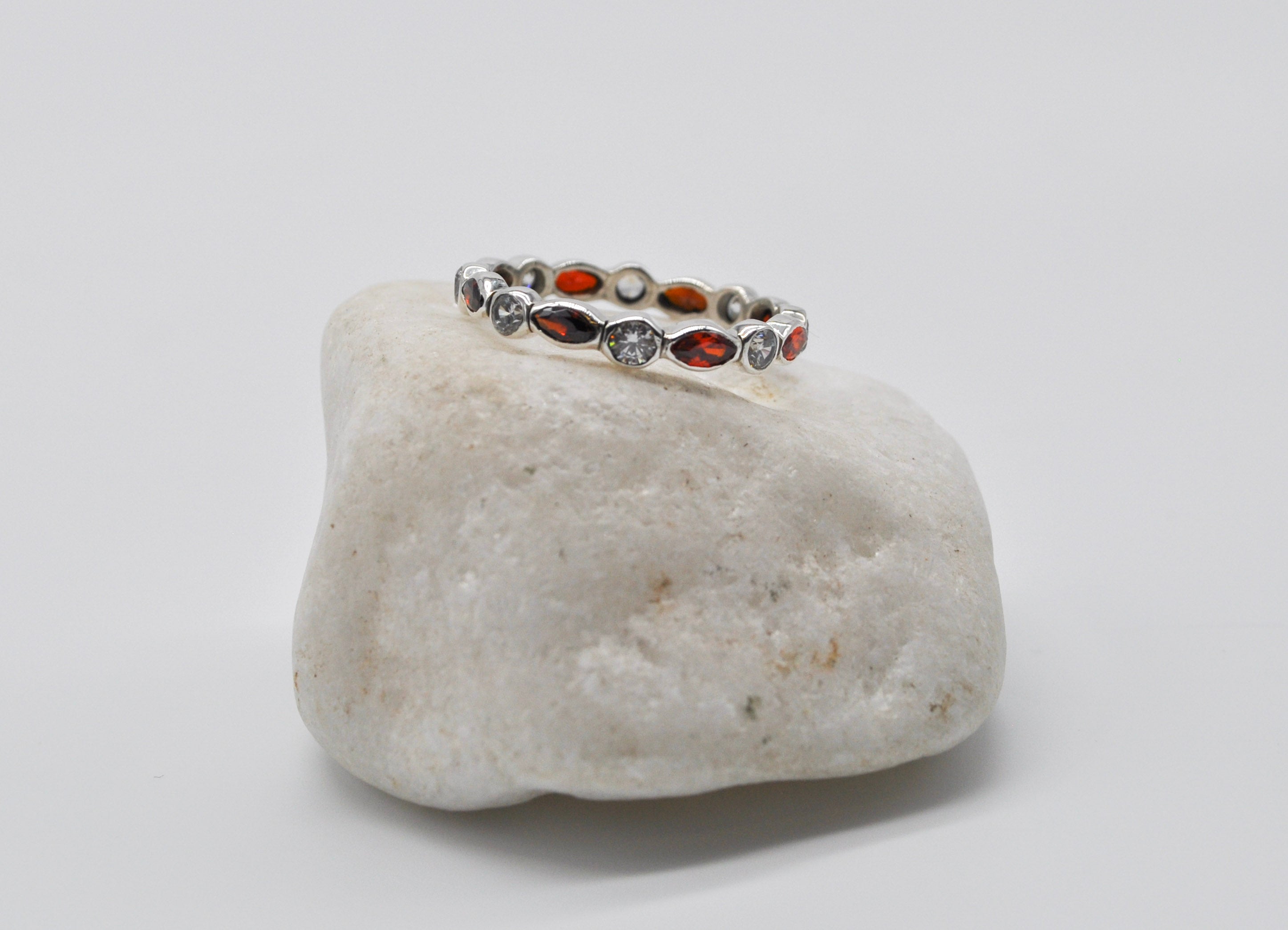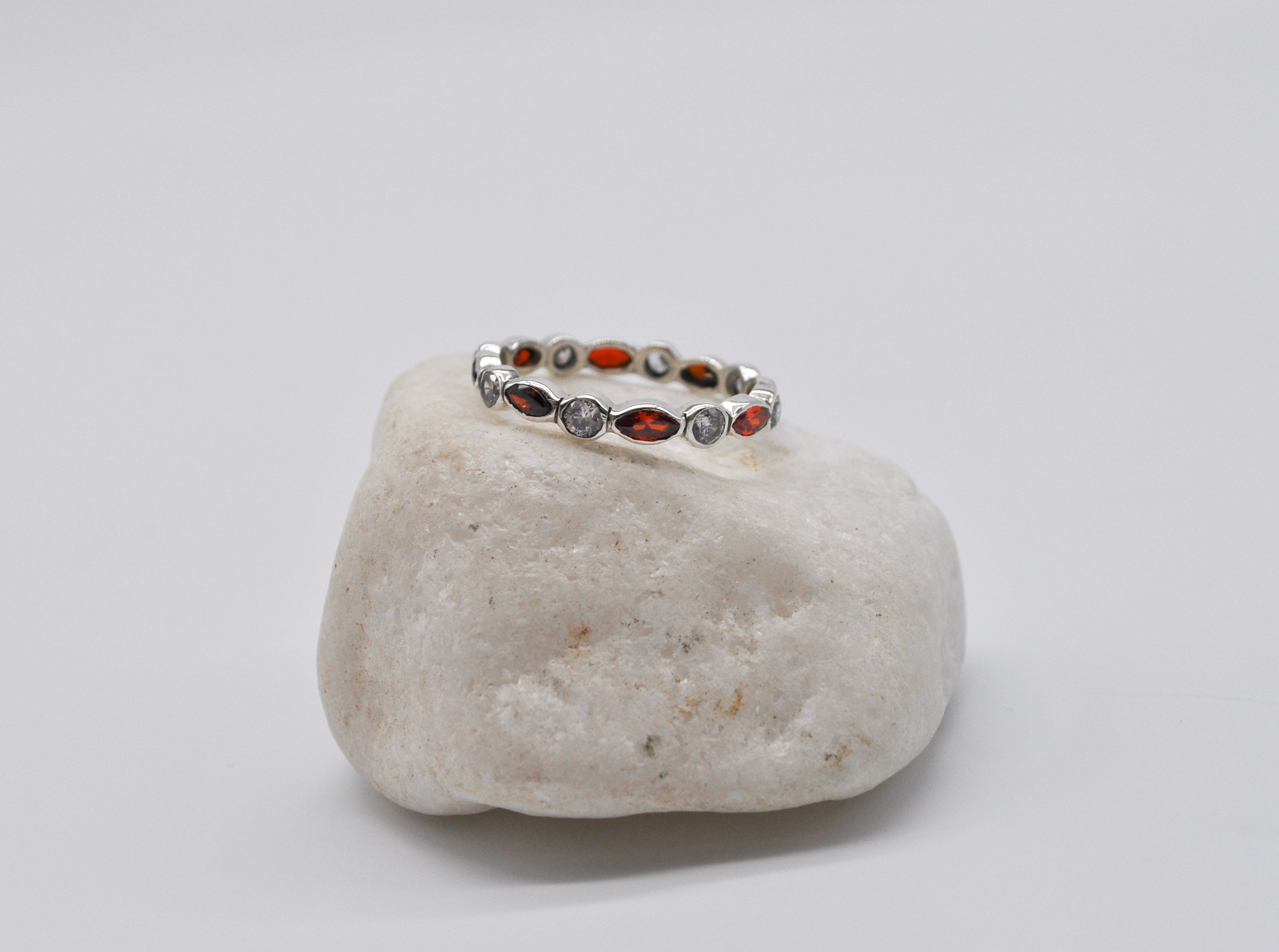 An eternity ring set with 16 shimmering Zircon, alternating between clear and garnet hue, set into Sterling Silver. The high lustre, refractive indices, and dispersion of Zircon give this beauty all the sparkle you need.