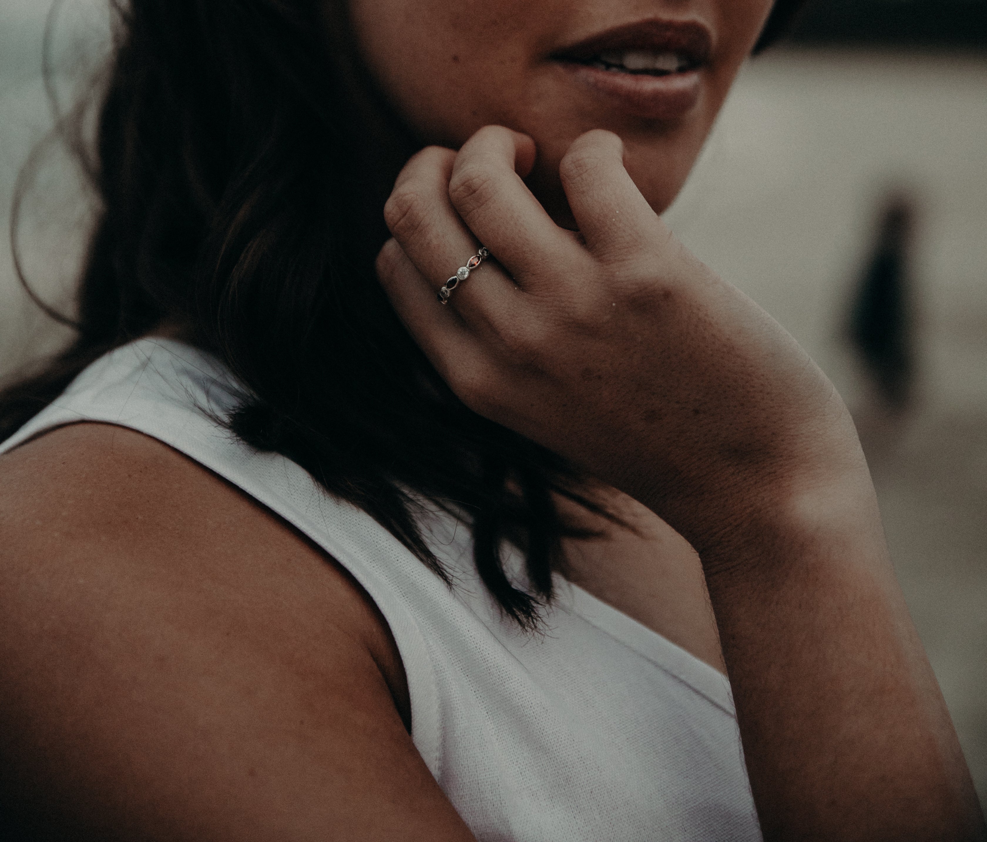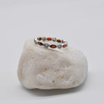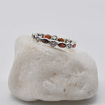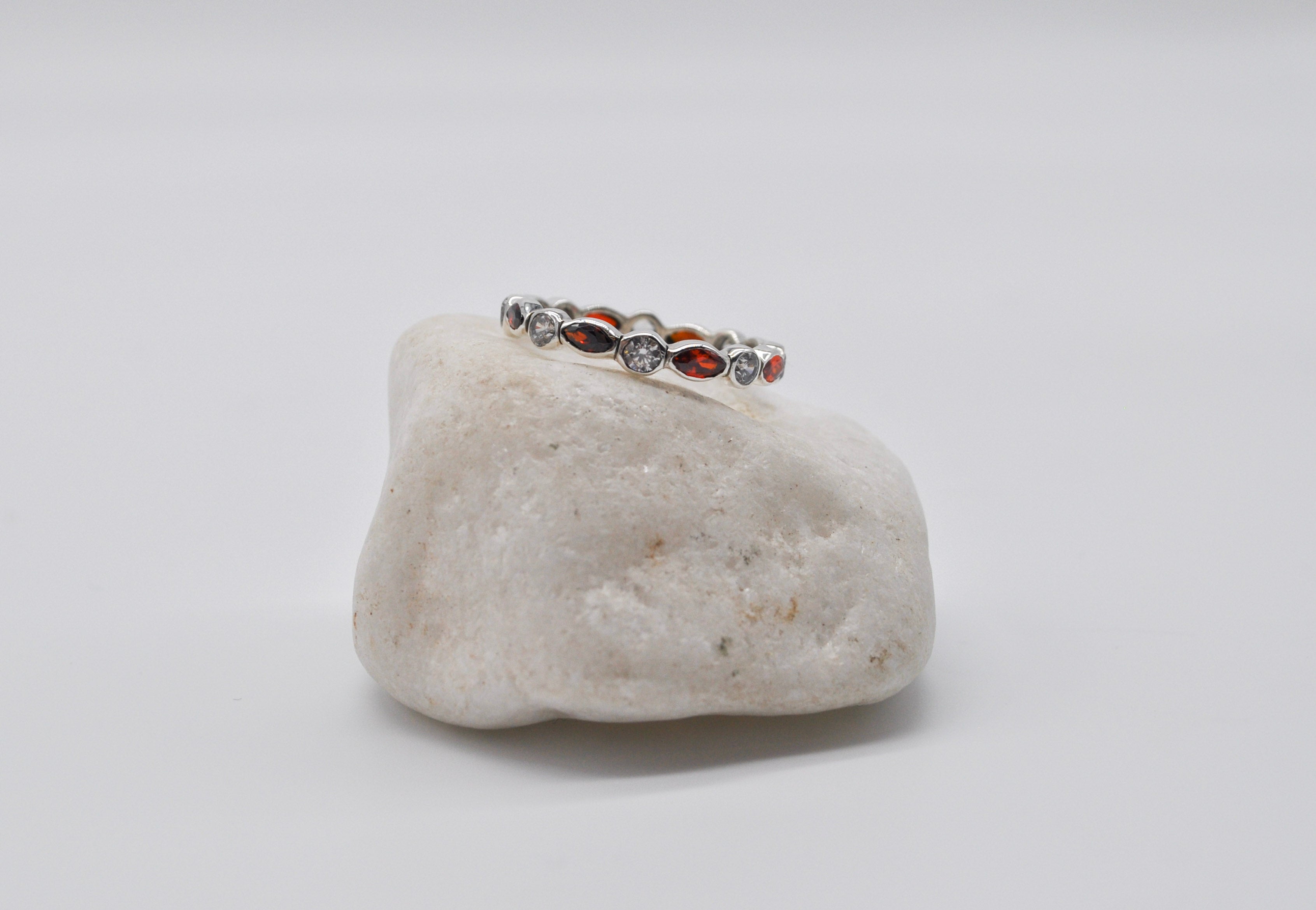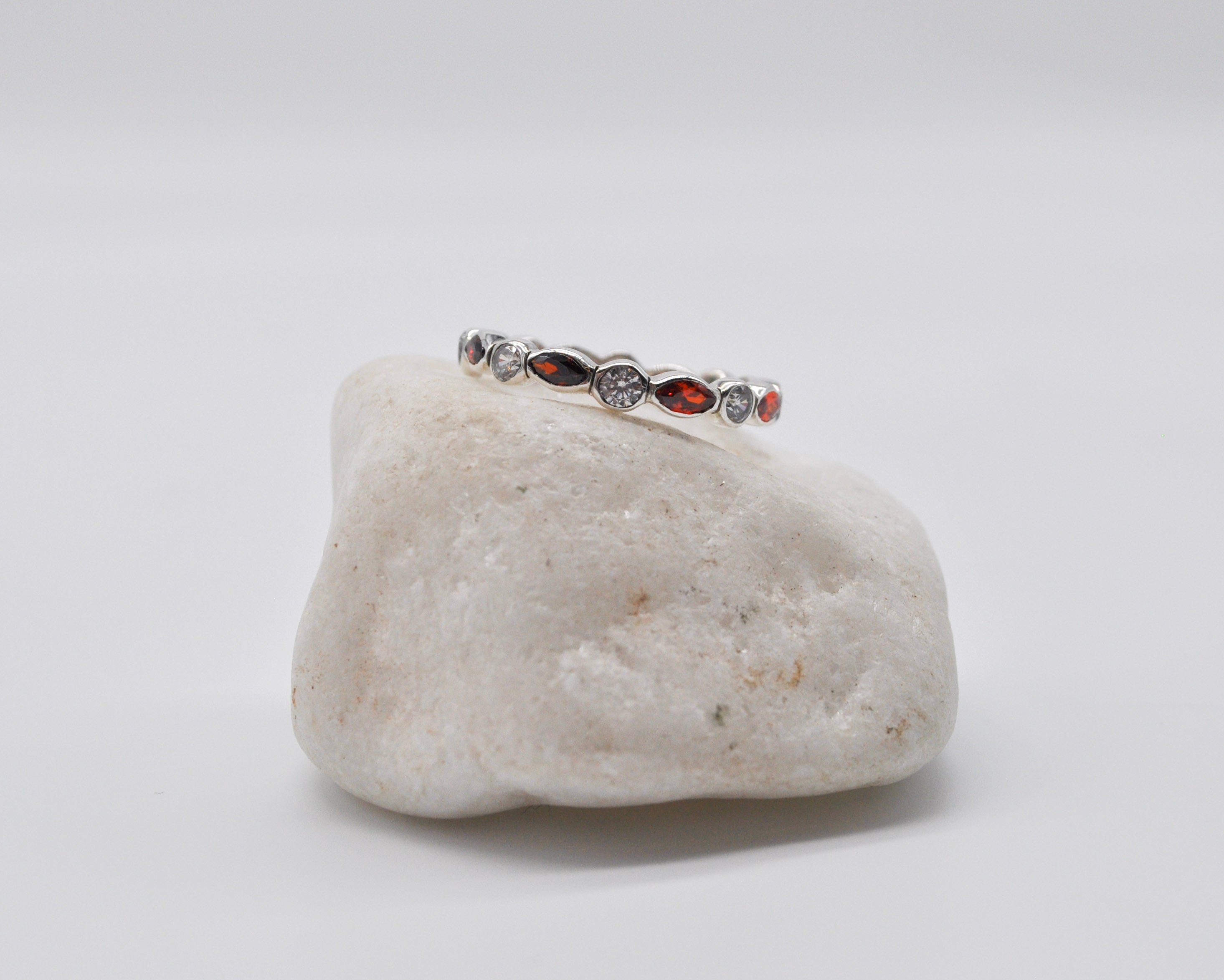 An eternity ring set with 16 shimmering Zircon, alternating between clear and garnet hue, set into Sterling Silver. The high lustre, refractive indices, and dispersion of Zircon give this beauty all the sparkle you need.