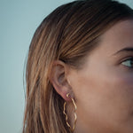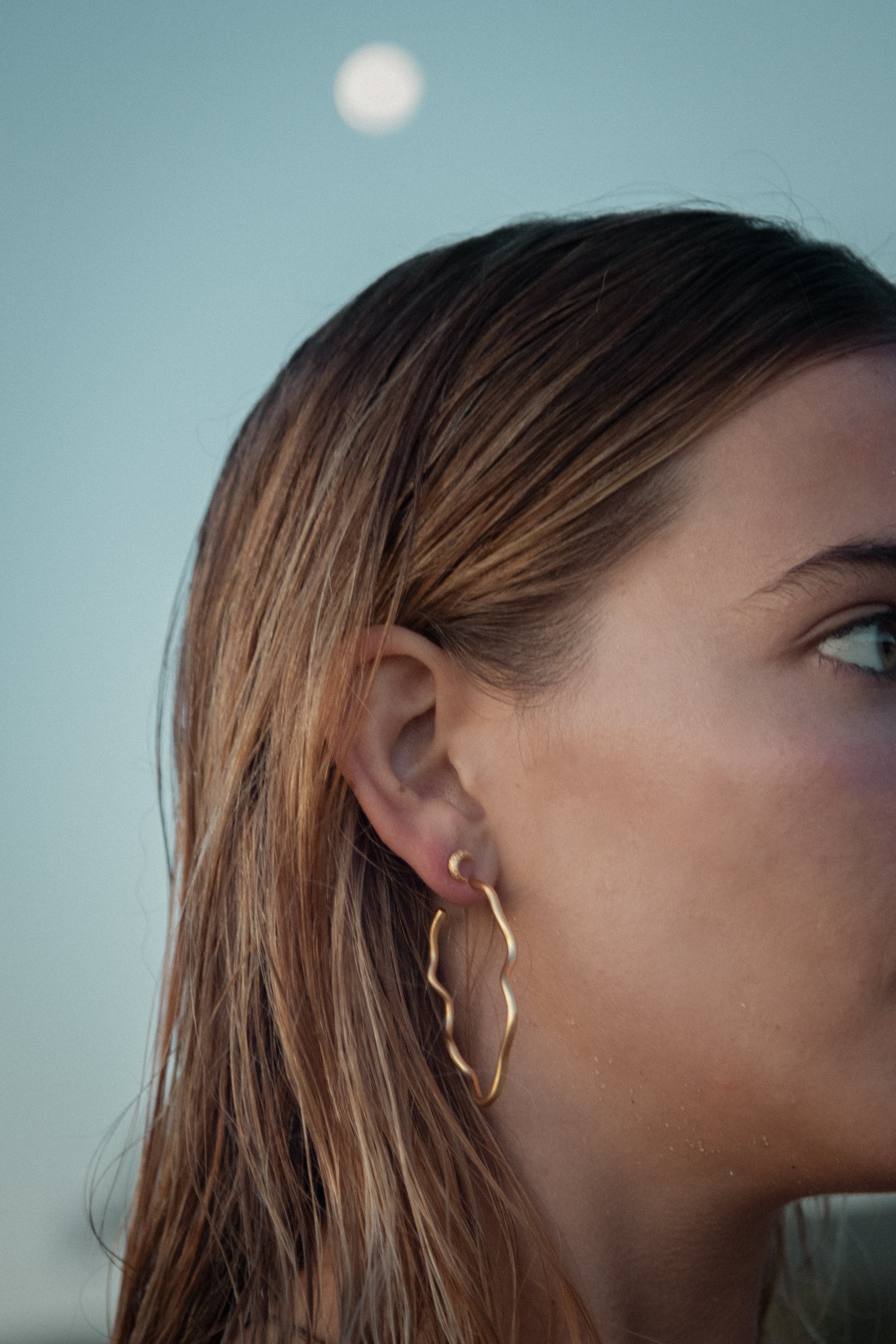 The Textured Tide Studs feature a sleek crescent design with subtle texture, perfect for stacking. Their minimalist elegance adds a sophisticated touch to any look, day or night.