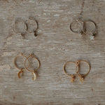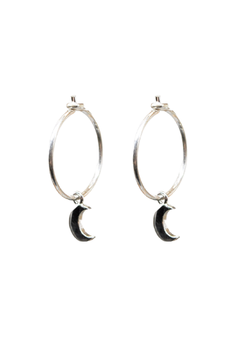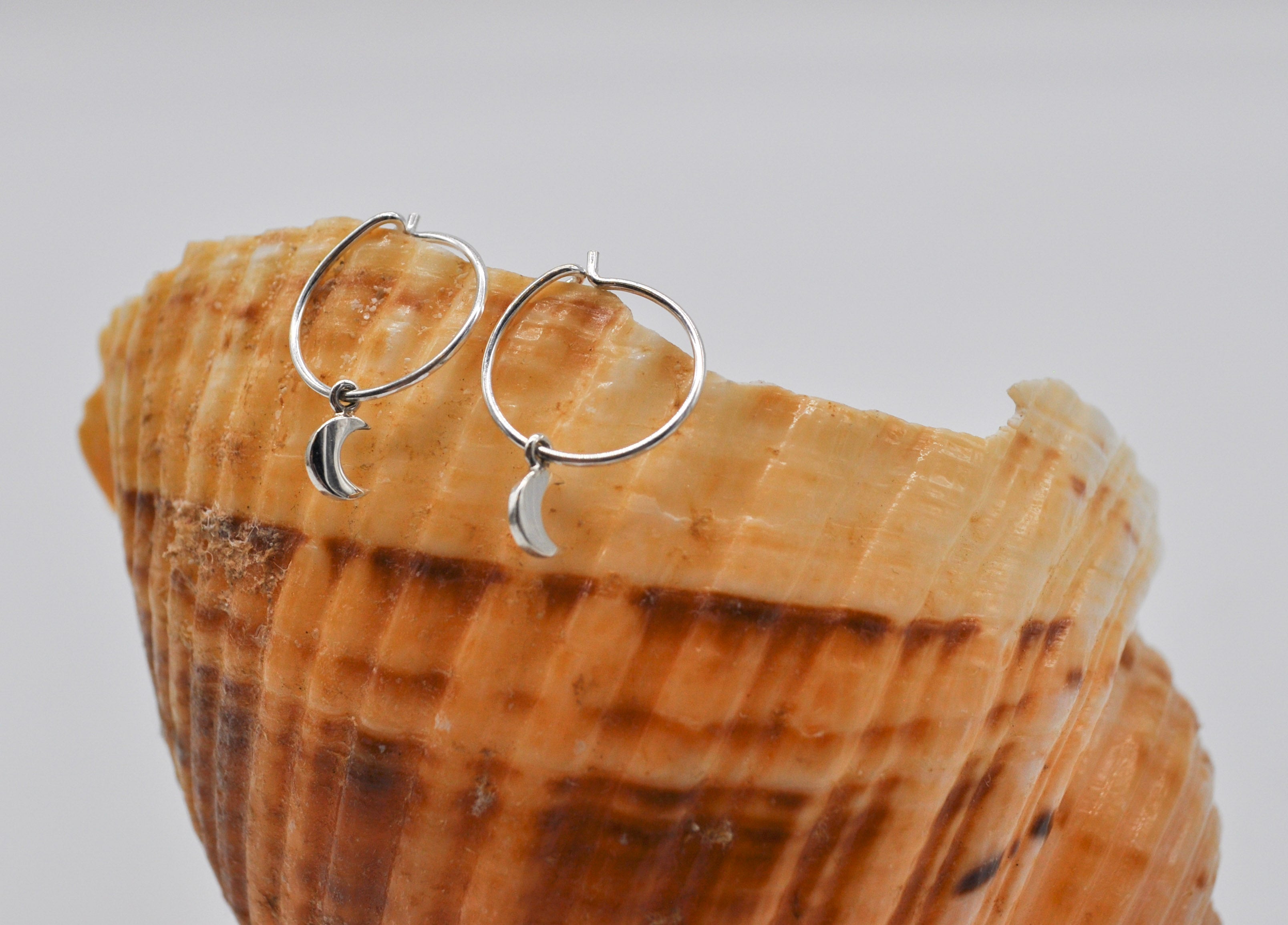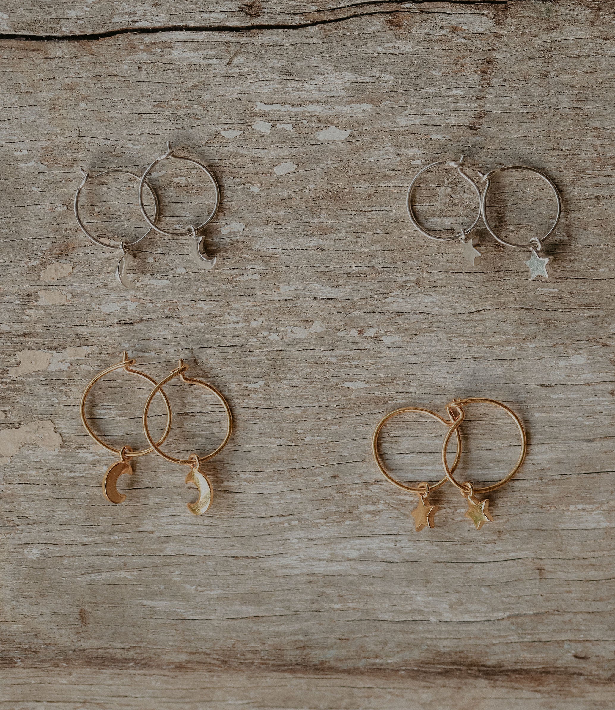 Simple little hoops that hug the ear, featuring sweet moon charms. Perfect to stack or beautiful on their own.