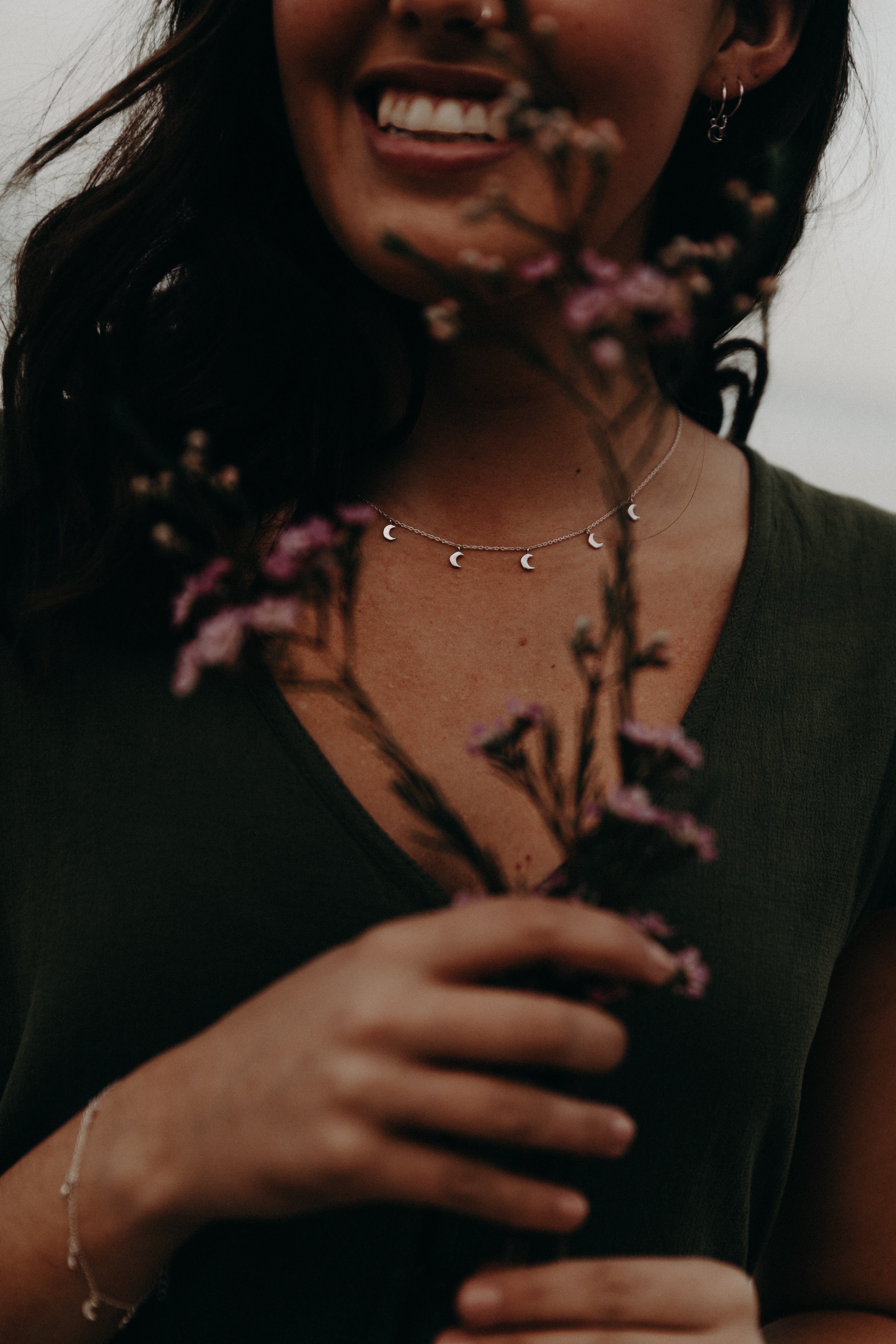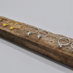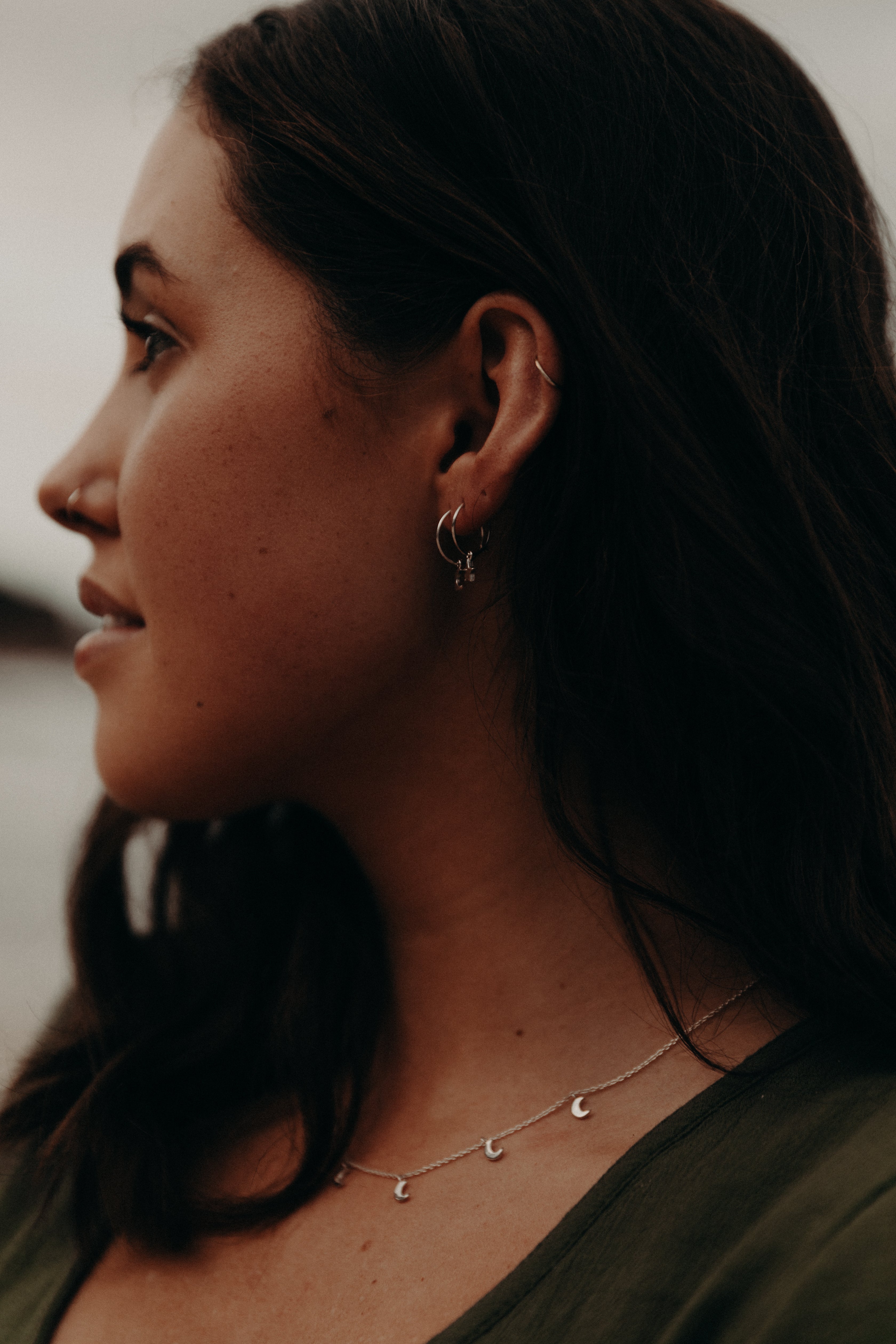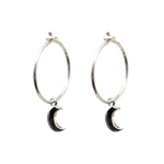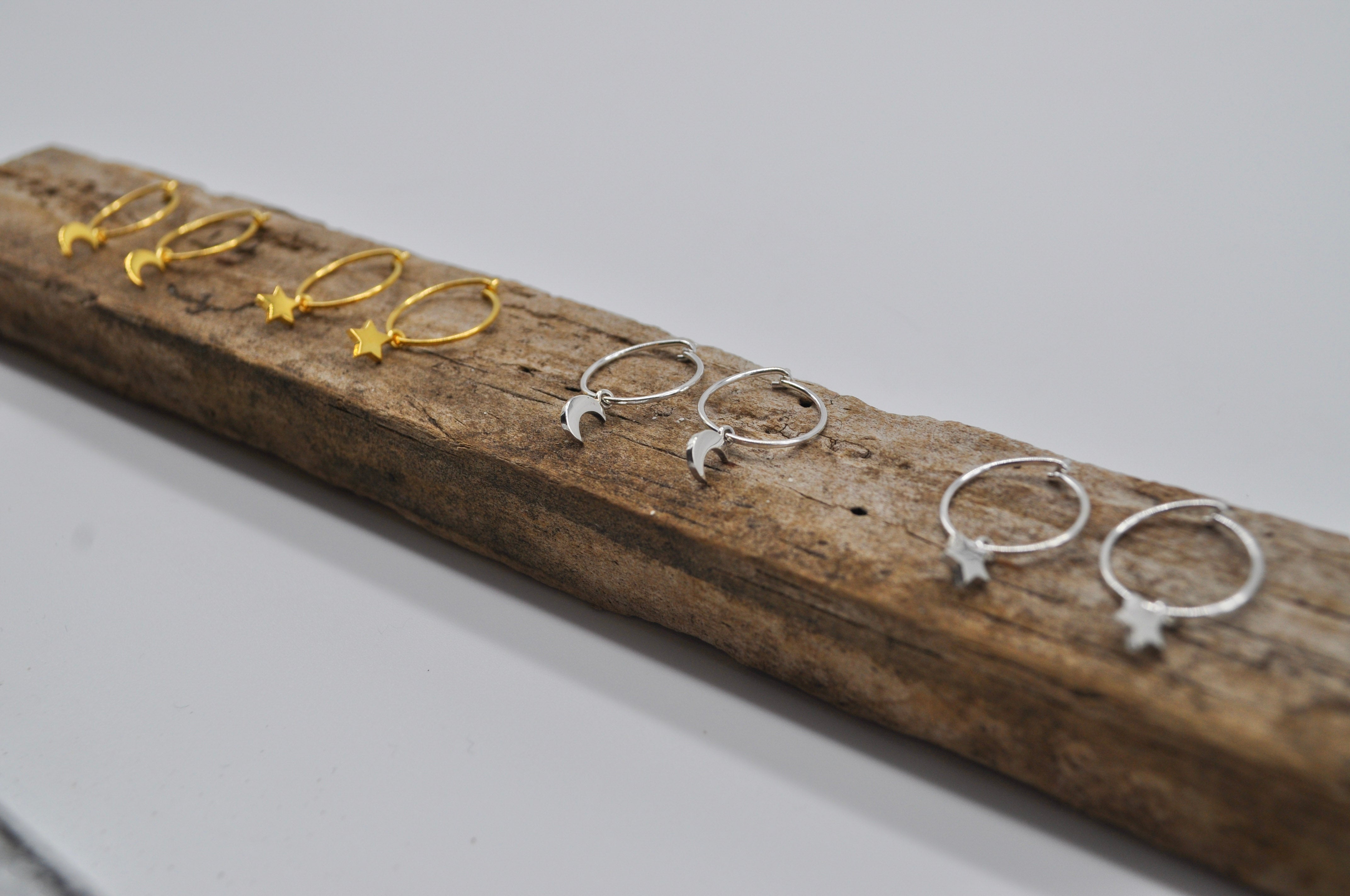 Simple little hoops that hug the ear, featuring sweet moon charms. Perfect to stack or beautiful on their own.