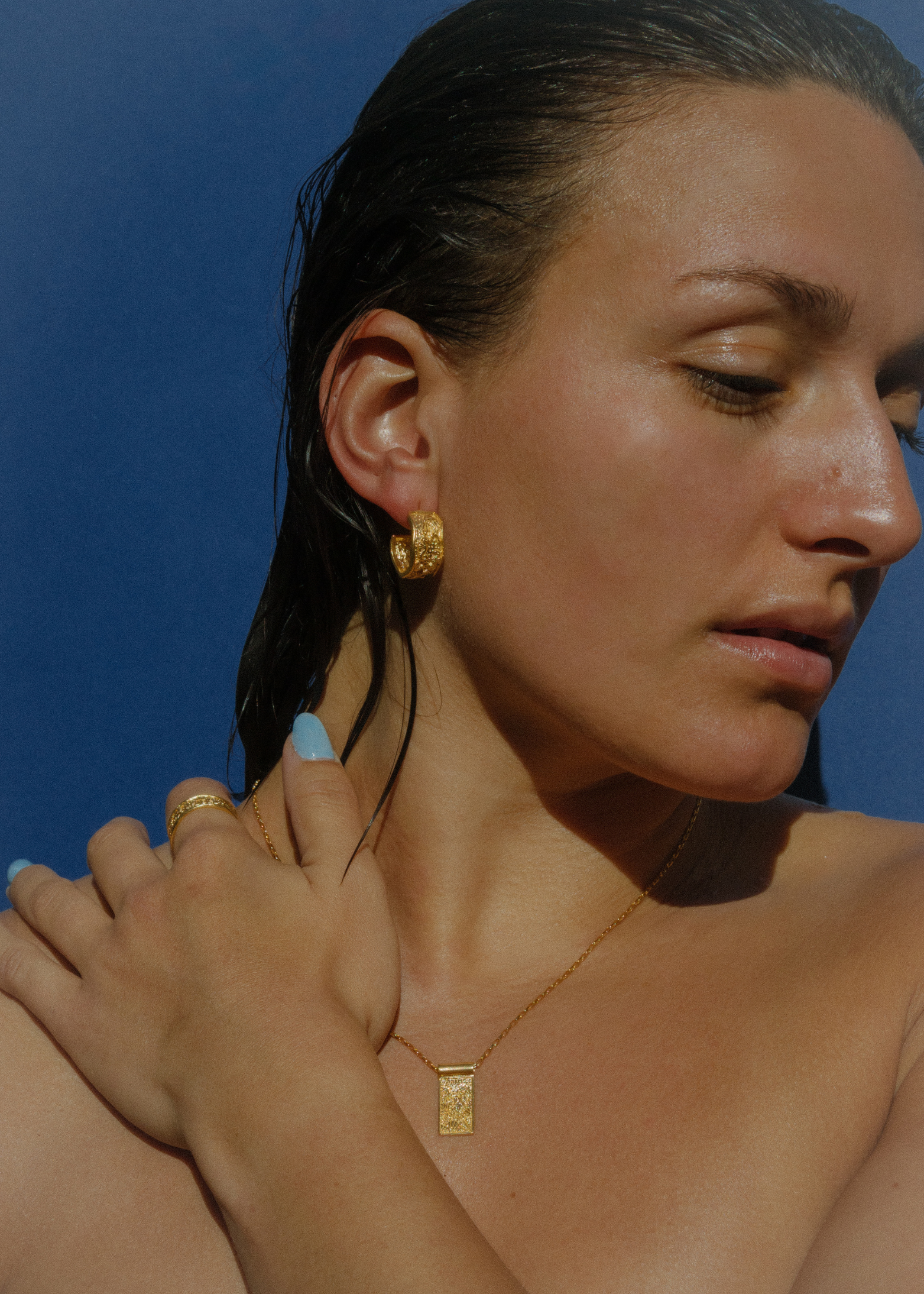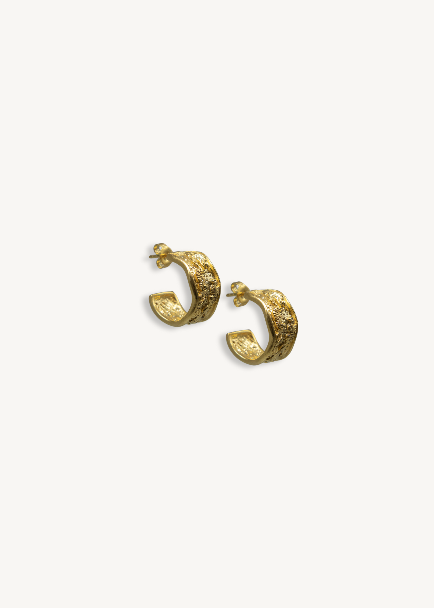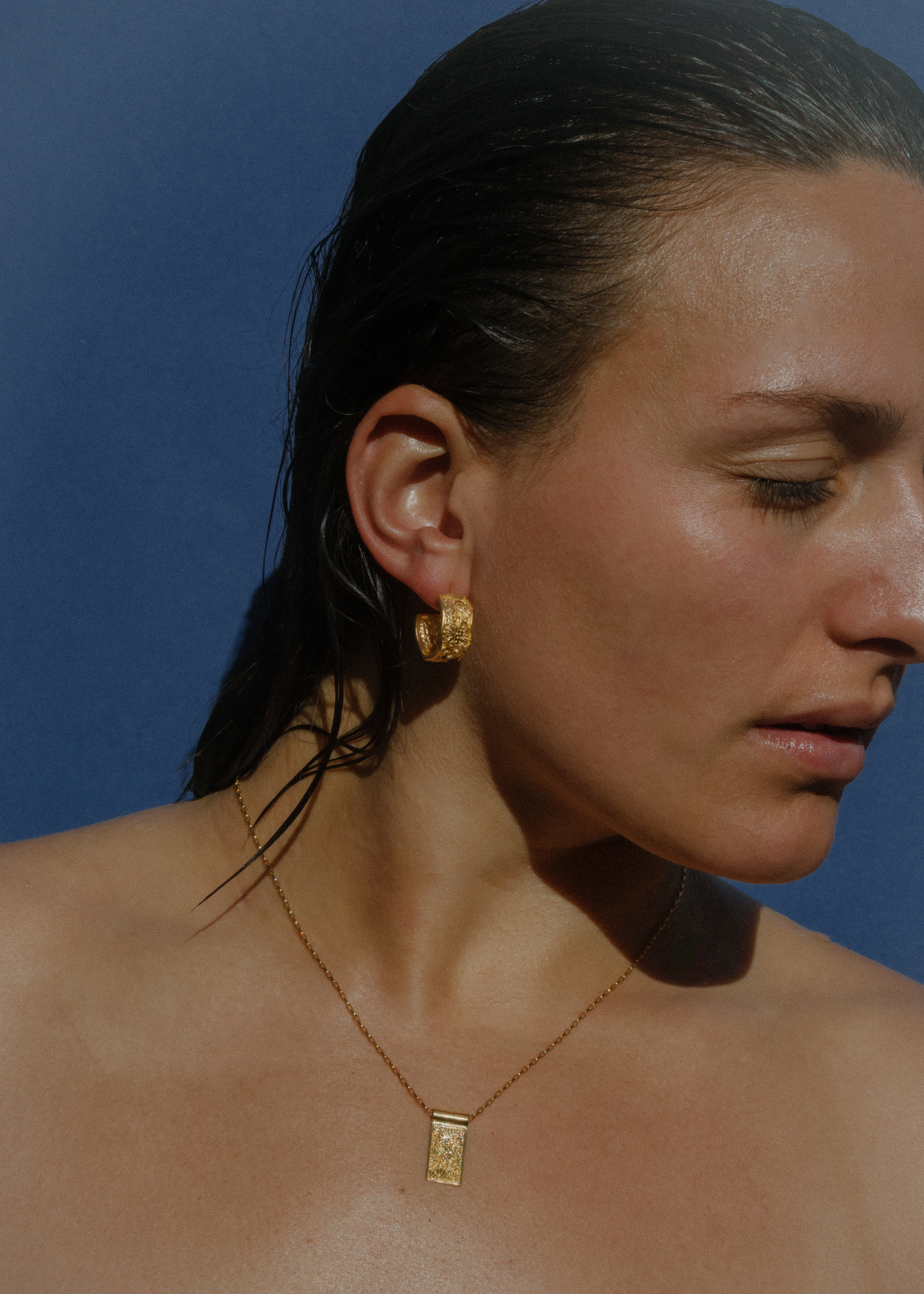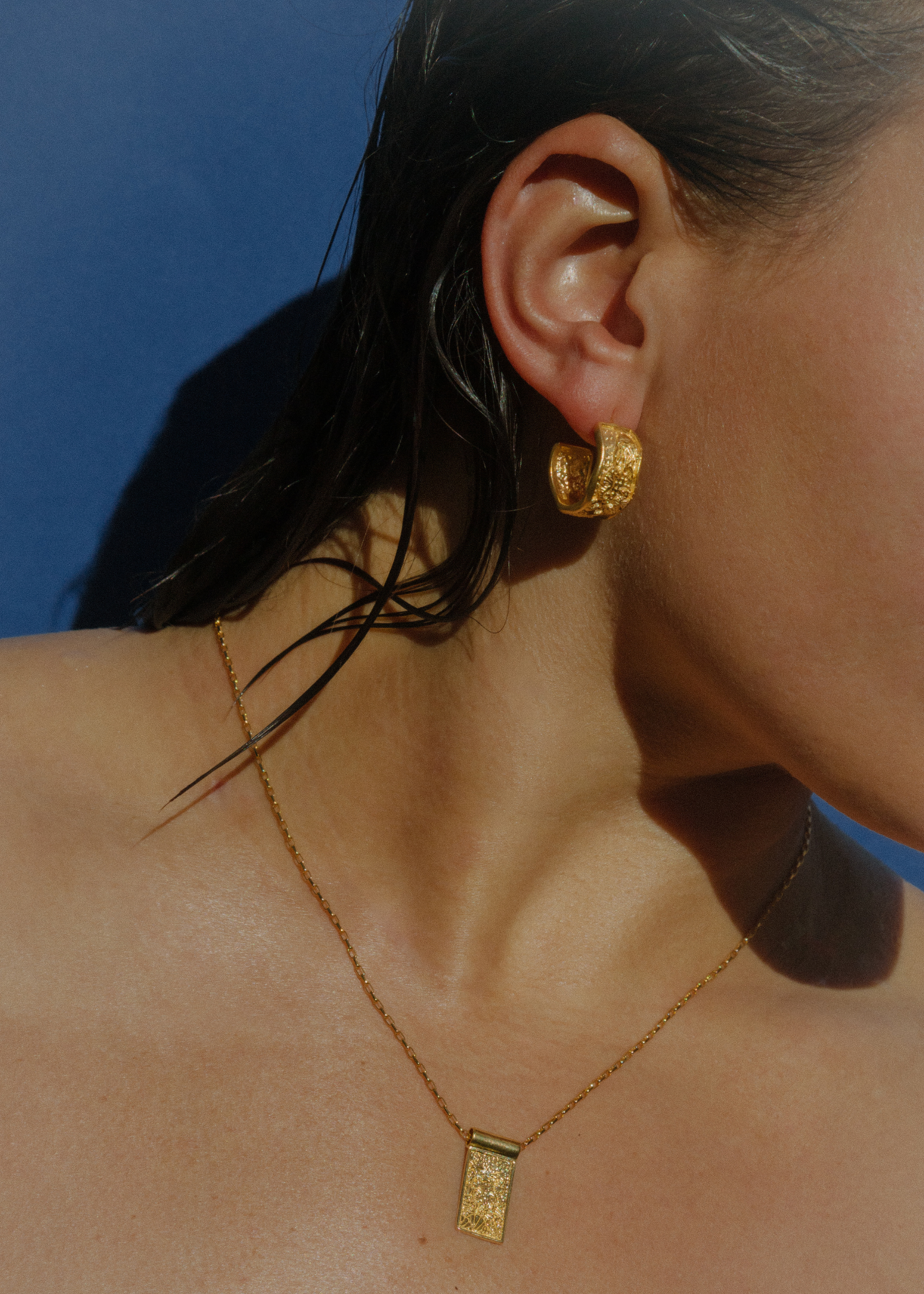 Underwater stories and glittering faraway sands are captured in our open hoop earrings. Their sculpted surface unfolds a subtle seascape of coral and marine life, with irregular edging like sunlight on the waves. Statement-making yet easy for everyday wear, they carry the quiet magic of the sea with every wear.