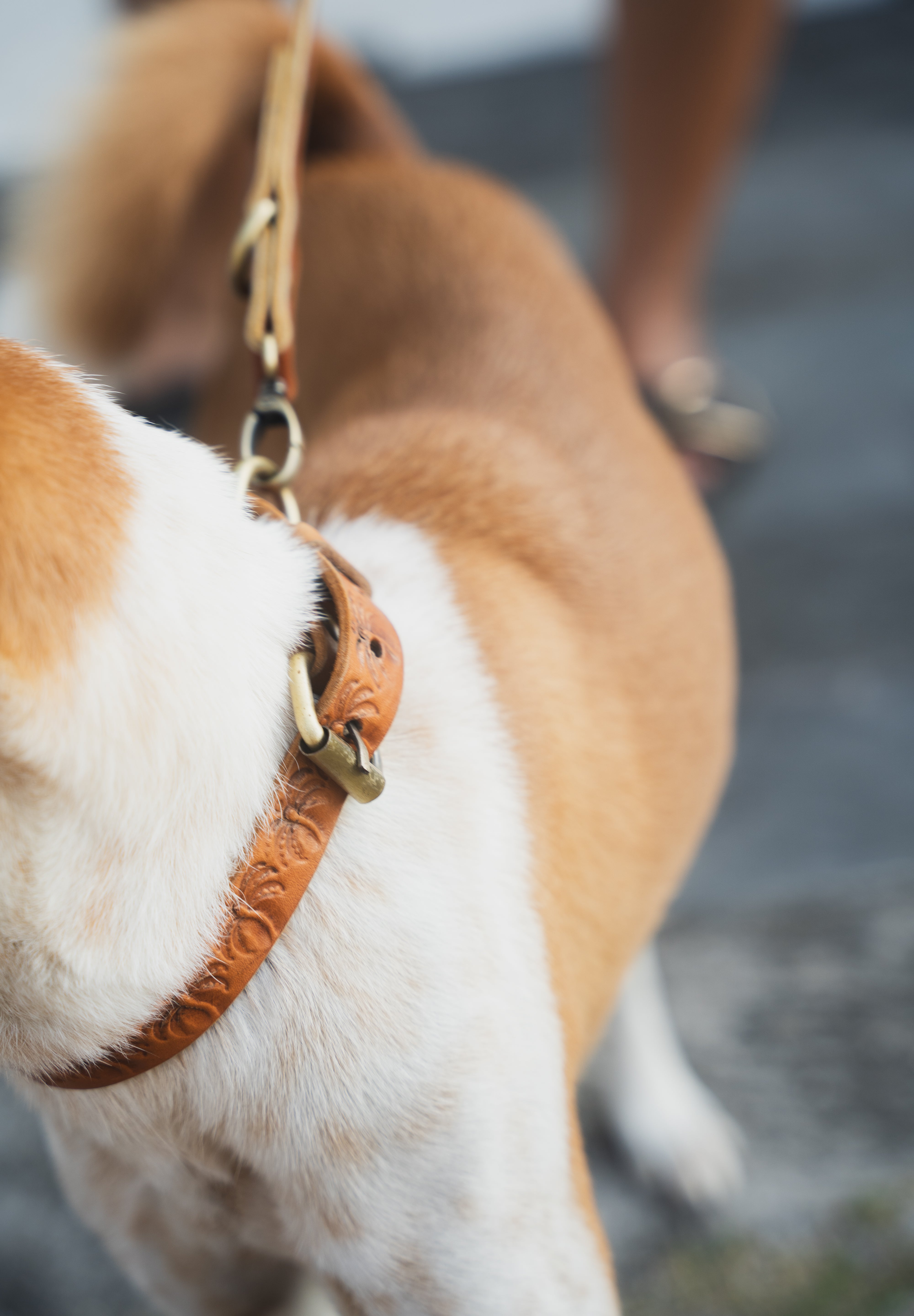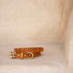 A summery leather collar with brass details, along with our hand embossed palm tree design. Featuring brass details and 5 collar holes to cater to most sized pups. H+H logo and size stitched on the inside of collar.