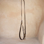 The Soleil dog lead is a practical yet stylish leather lead for your pooch. Featuring a double lined handle for comfort along with two brass loops for two length options to keep your little loved one close if needed. H+H logo hand embossed on lead.