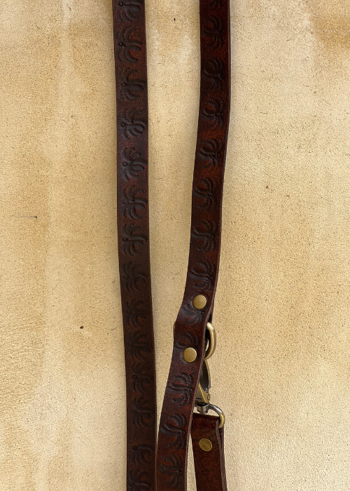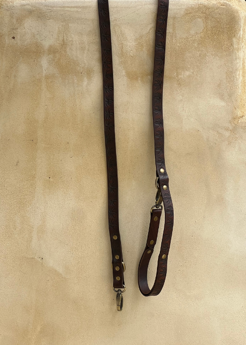 The Island Lead is a practical yet stylish leather lead for your pooch. Featuring our hand embossed palm tree design, a double lined handle for comfort along with two brass loops for two length options to keep your little loved one close if needed. H+H logo hand embossed on lead.