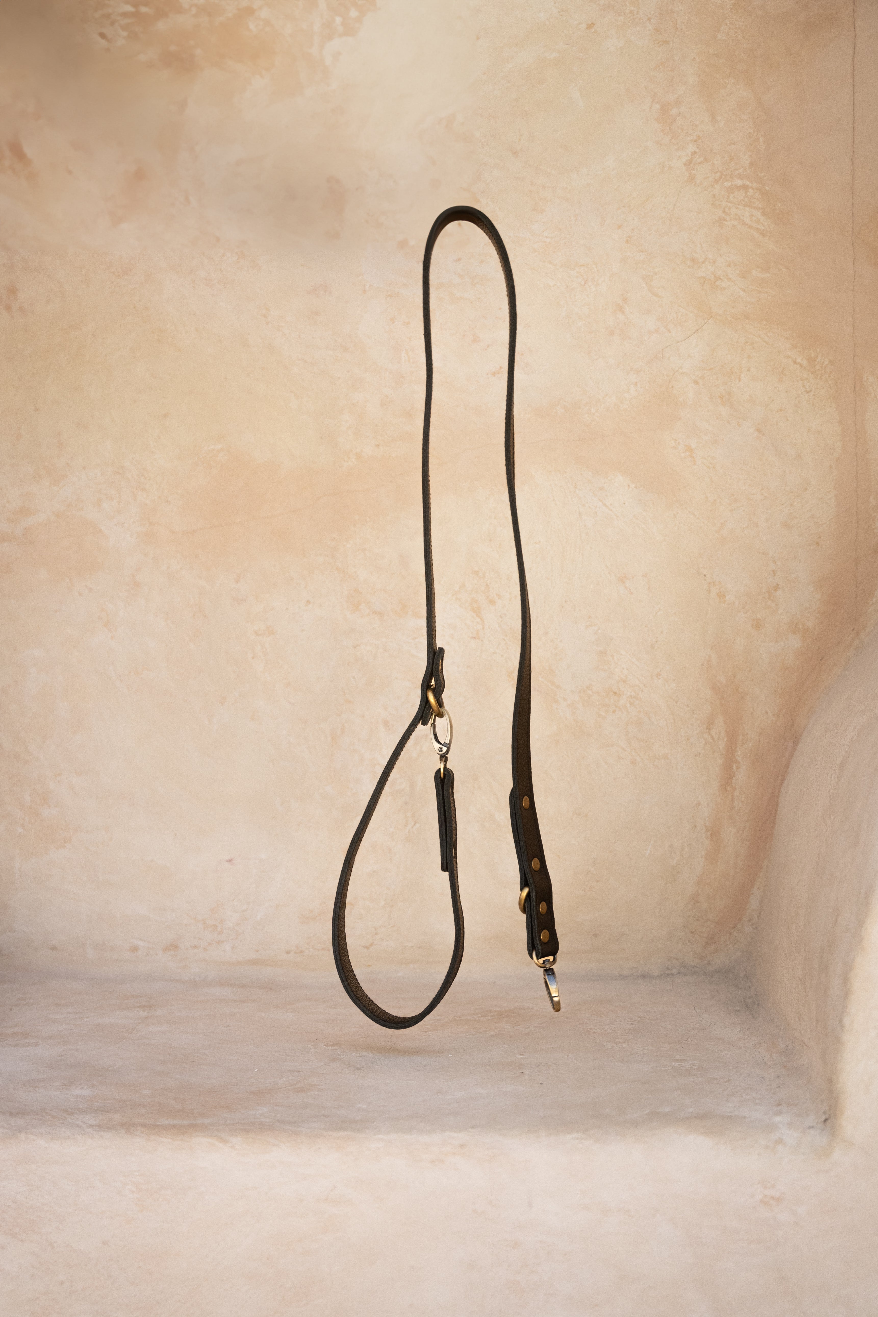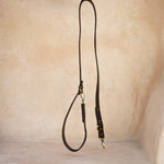The Soleil dog lead is a practical yet stylish leather lead for your pooch. Featuring a double lined handle for comfort along with two brass loops for two length options to keep your little loved one close if needed. H+H logo hand embossed on lead.