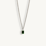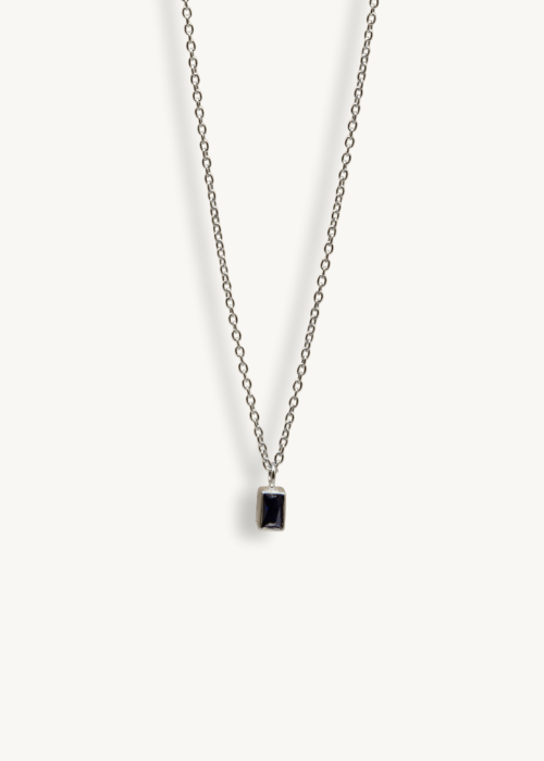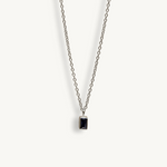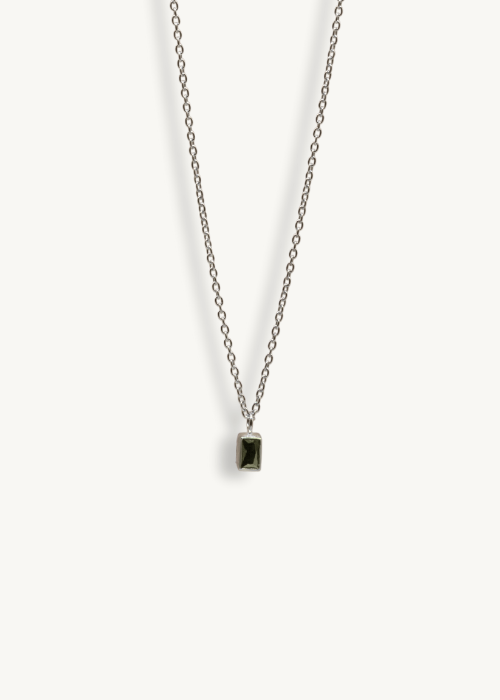 The Ina Necklace features a delicate, rectangular pendant with a simple polished stone, set in a textured casing, suspended on a fine gold chain. Its minimalist design adds a subtle, refined touch to any outfit—perfect for everyday elegance.