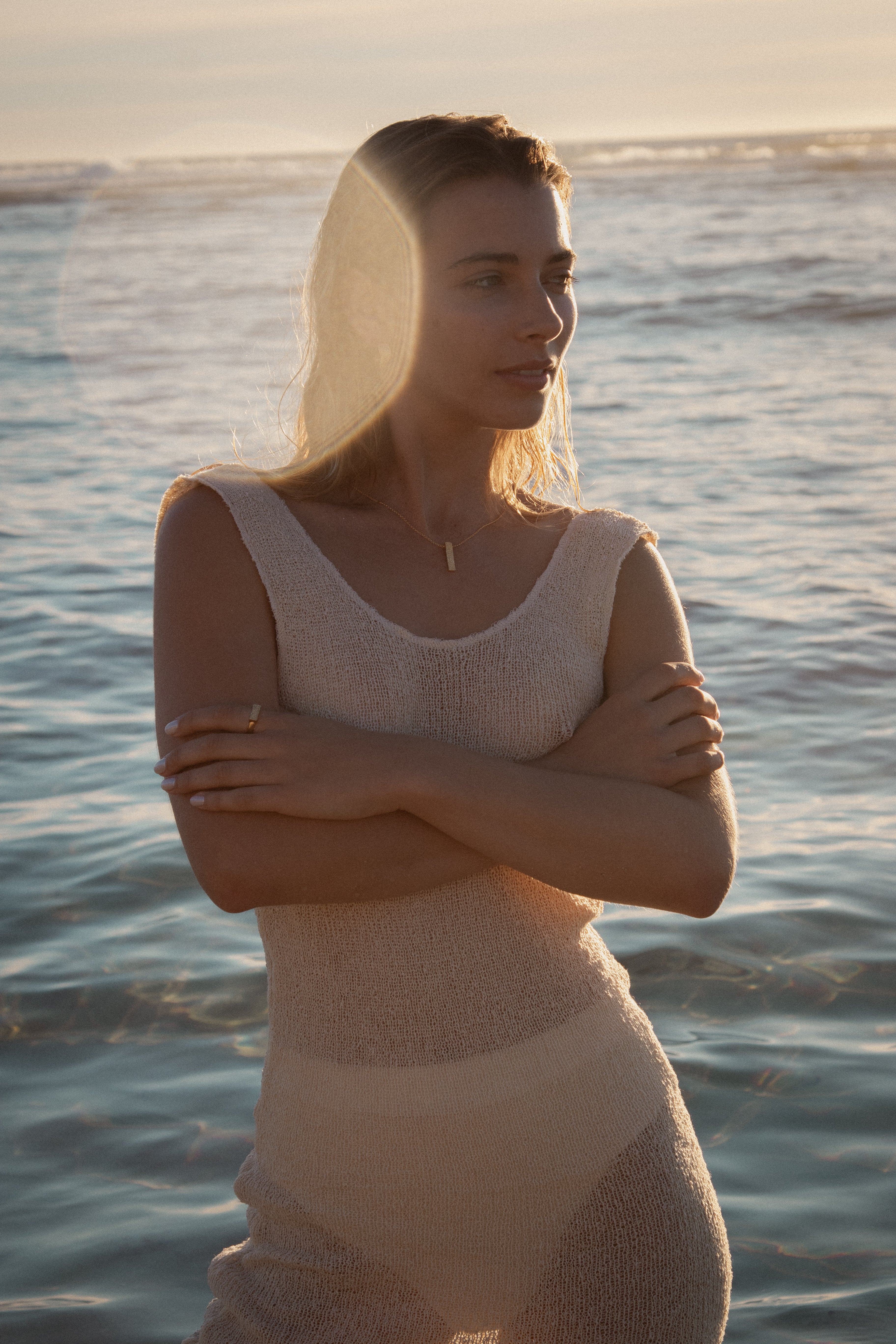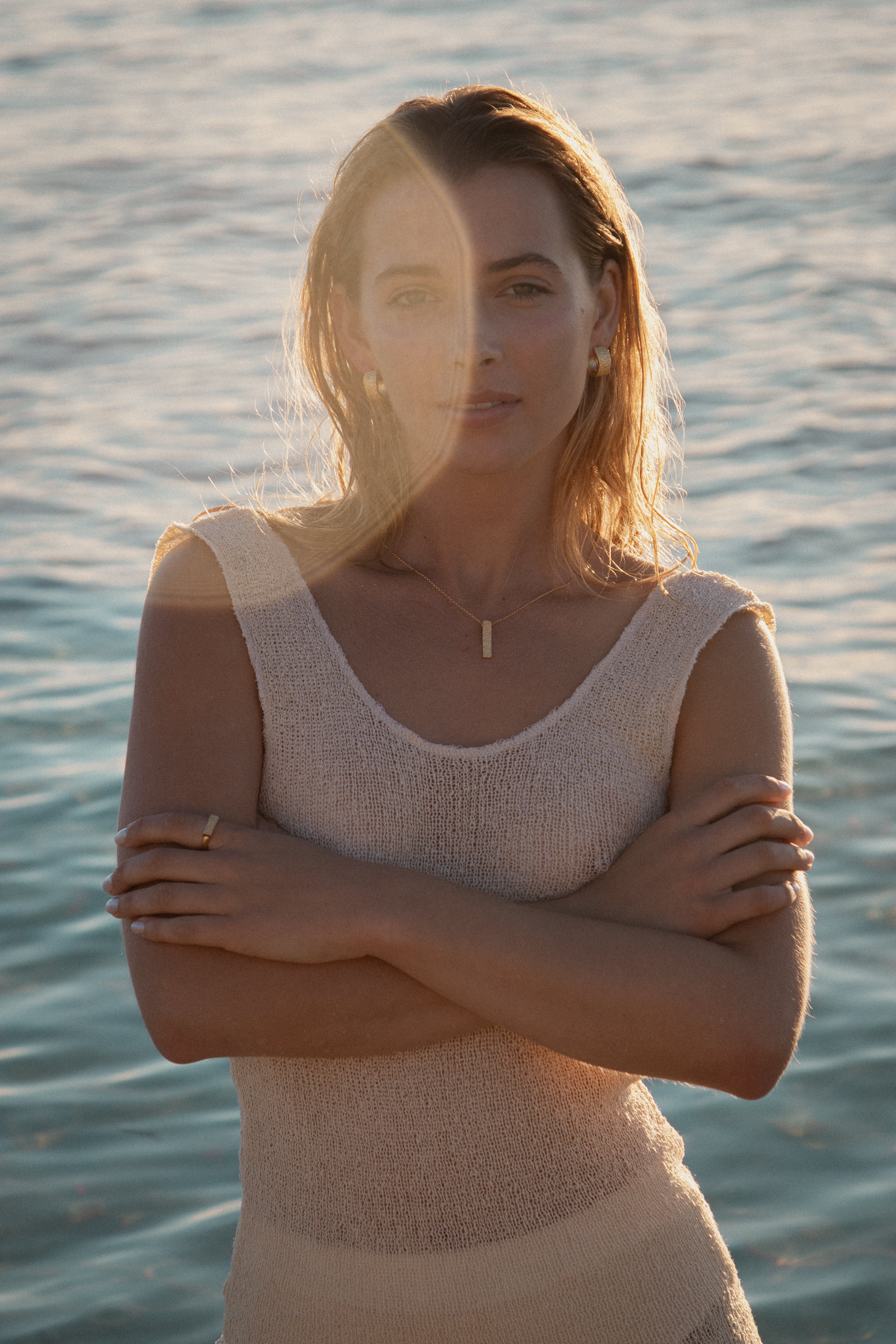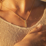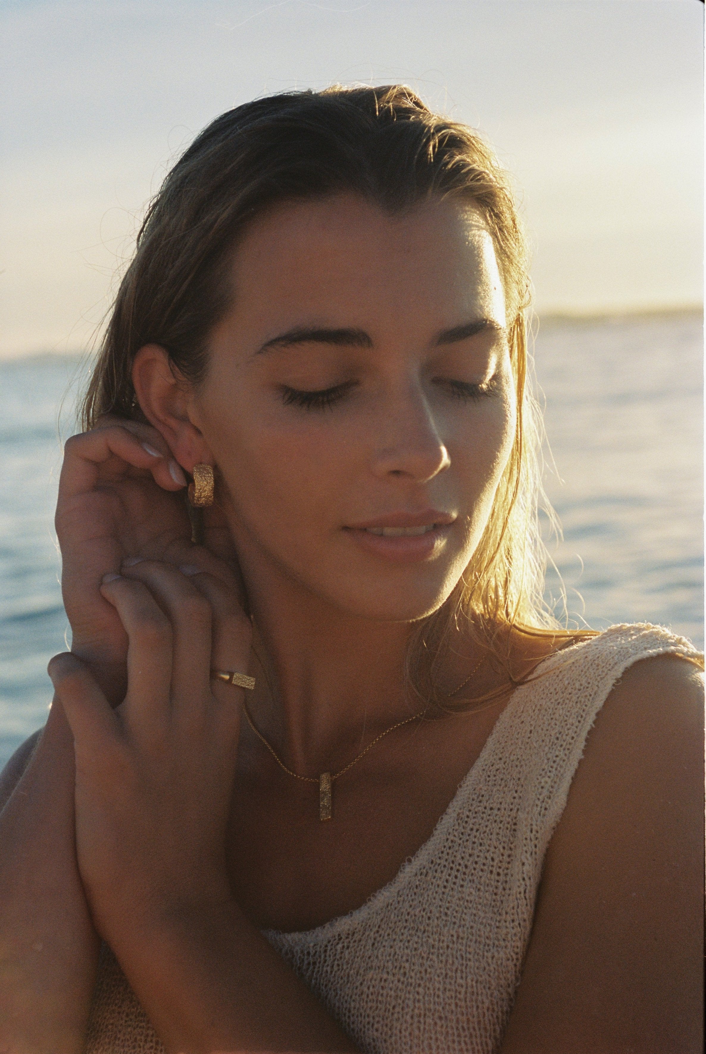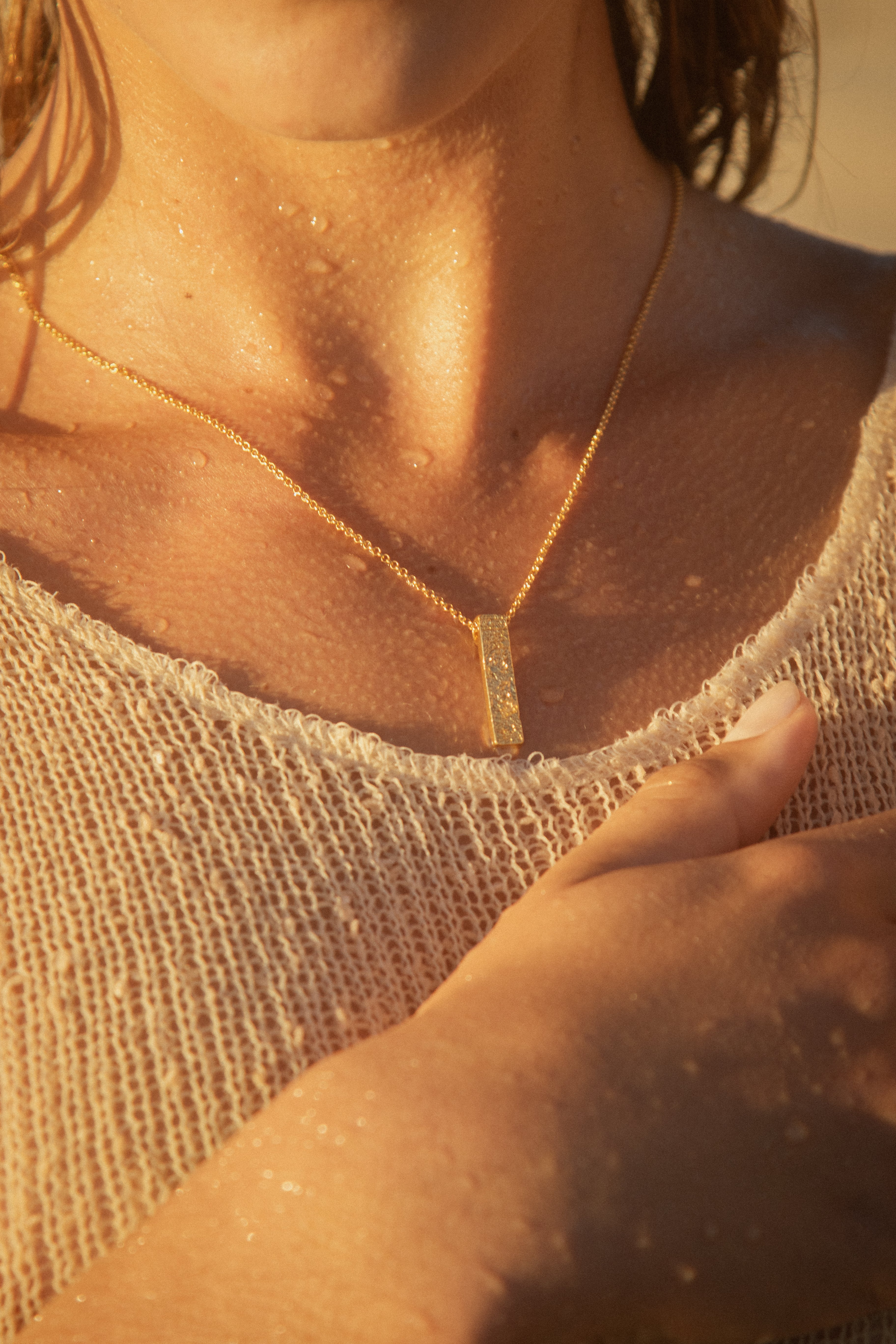 The namesake of this collection features a textured gold rectangular pendant on a fine chain, the Pacific Necklace blends minimalist charm with timeless elegance—perfect for any occasion.