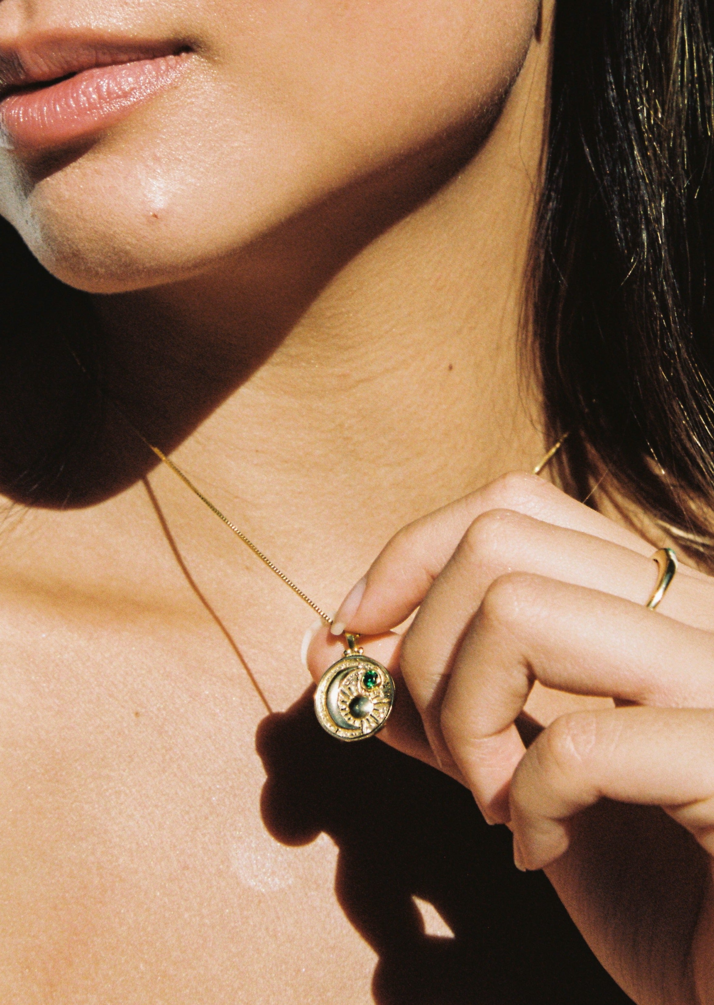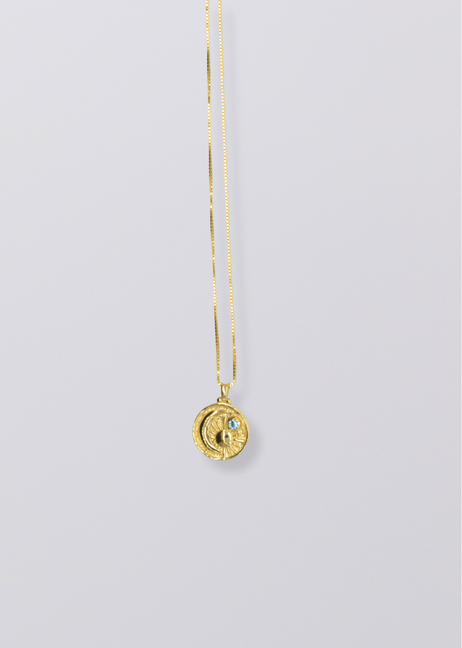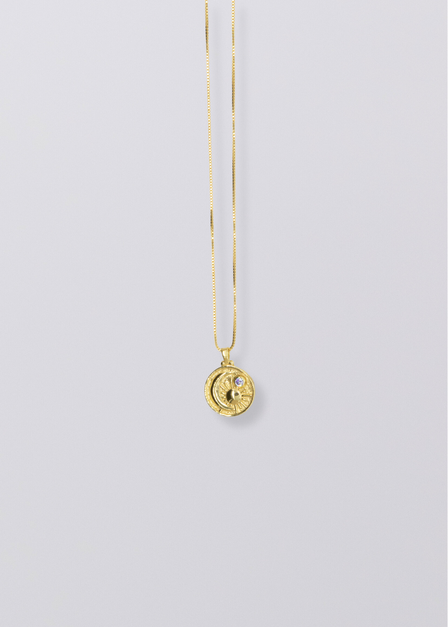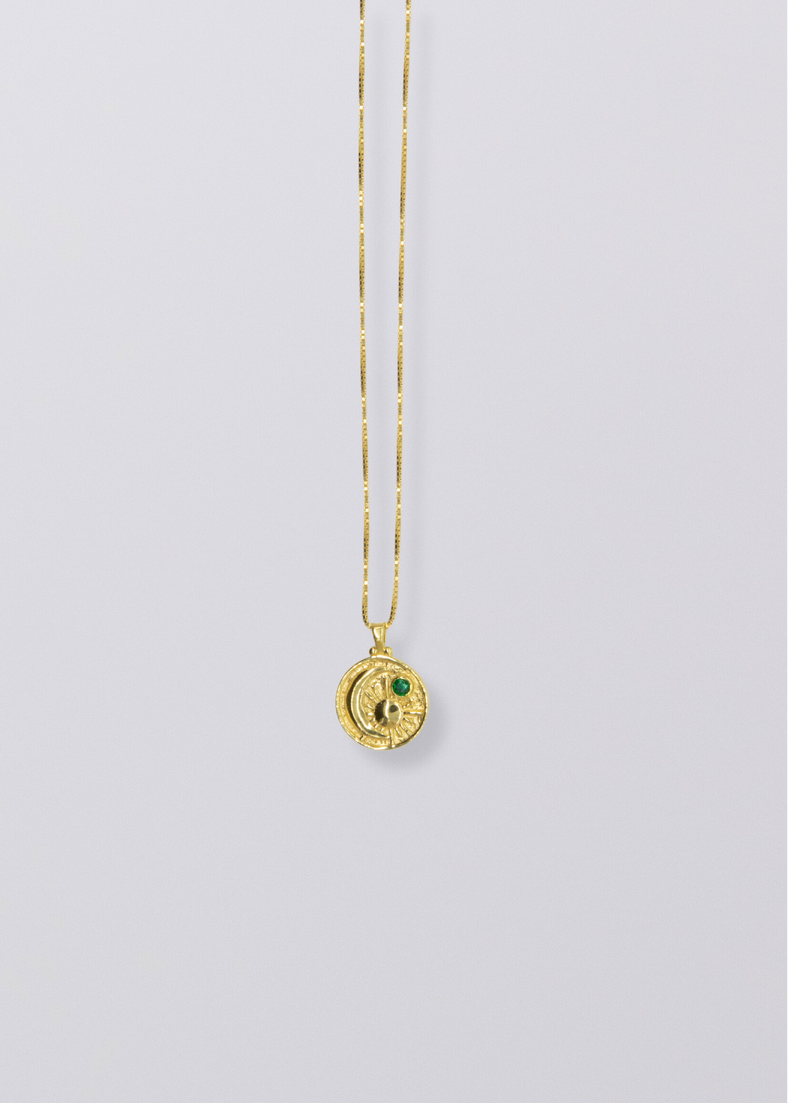 The Selene Necklace is a homage to the interplay of the Moon and the Sun, the necklace features a round pendant showcasing both celestial bodies and a small gemstone. Available in various colours, the stone allows you to personalize this understated piece, suspended on a chic box chain, as a subtle reminder of the perpetual dance between day and night, light and dark - always remember that one cannot exist without the other. With 12 stones to choose from, there is something for everyone.