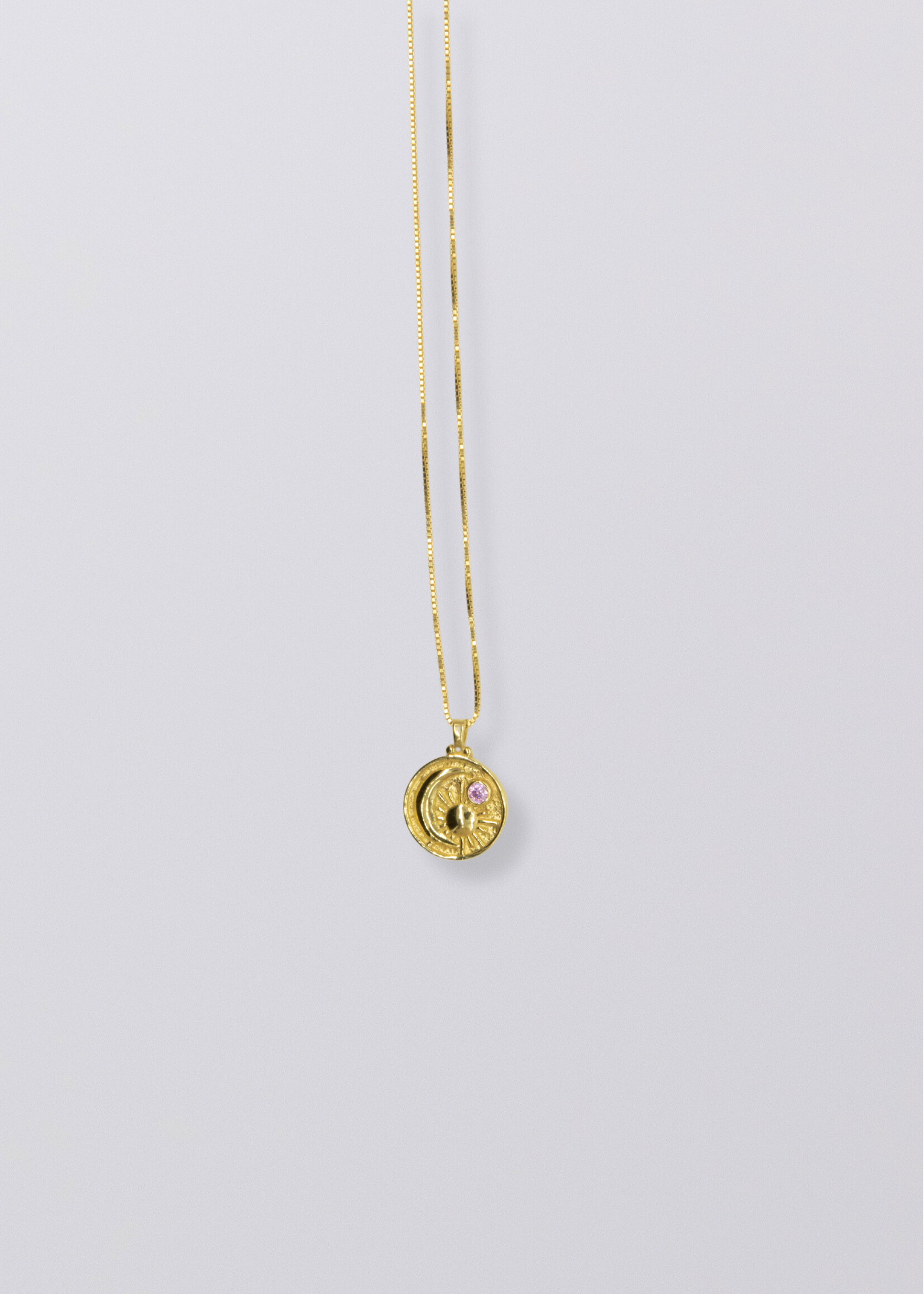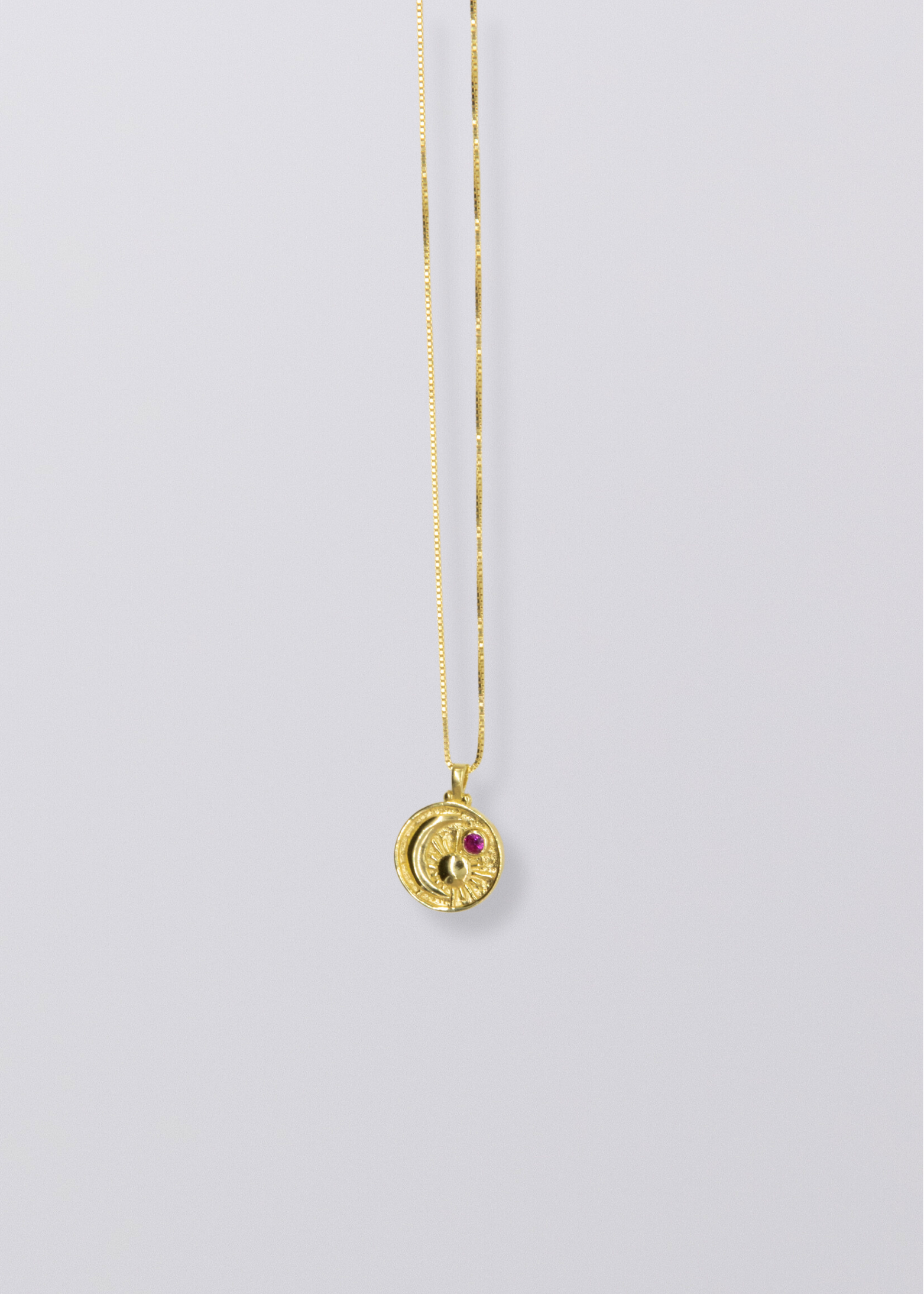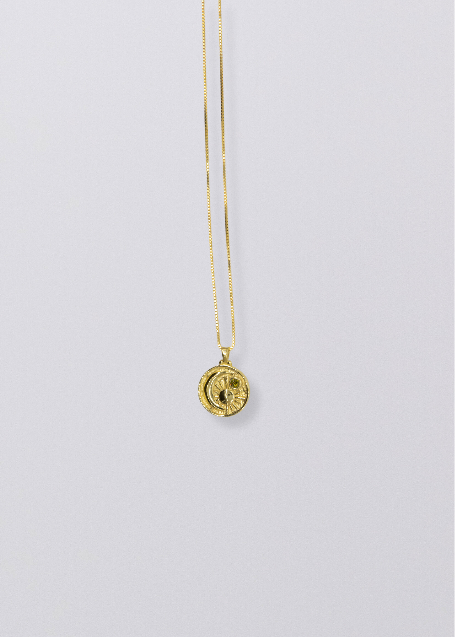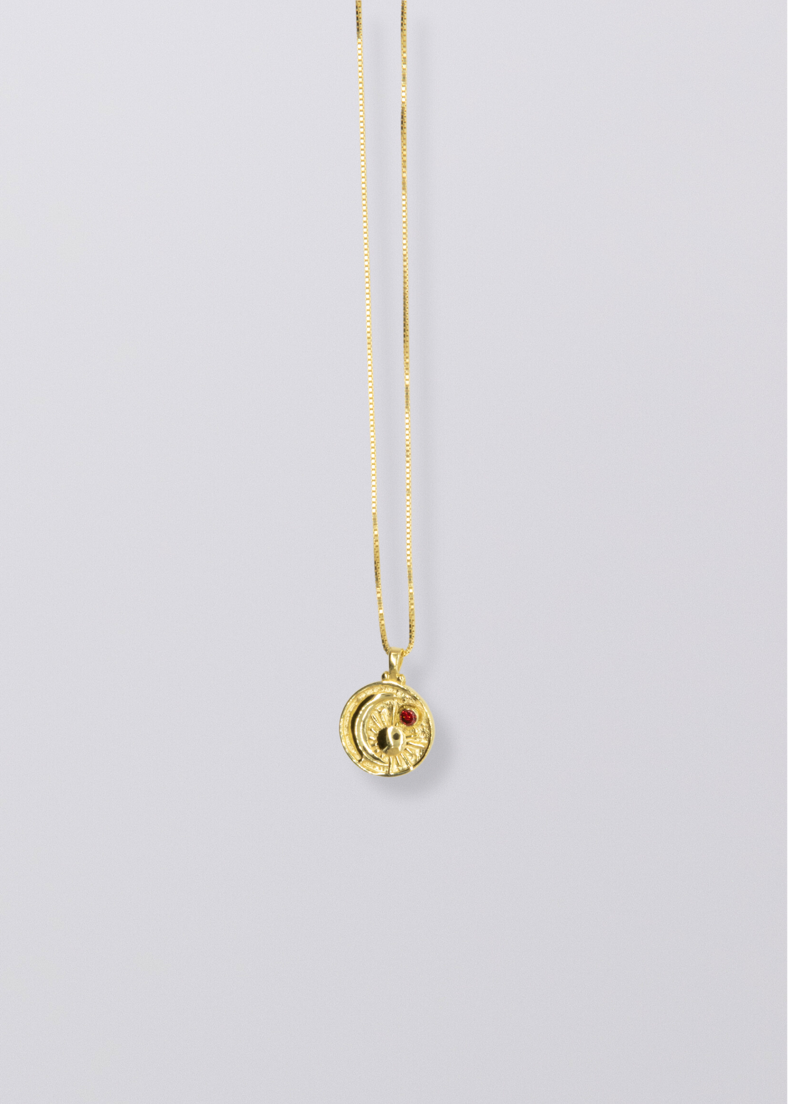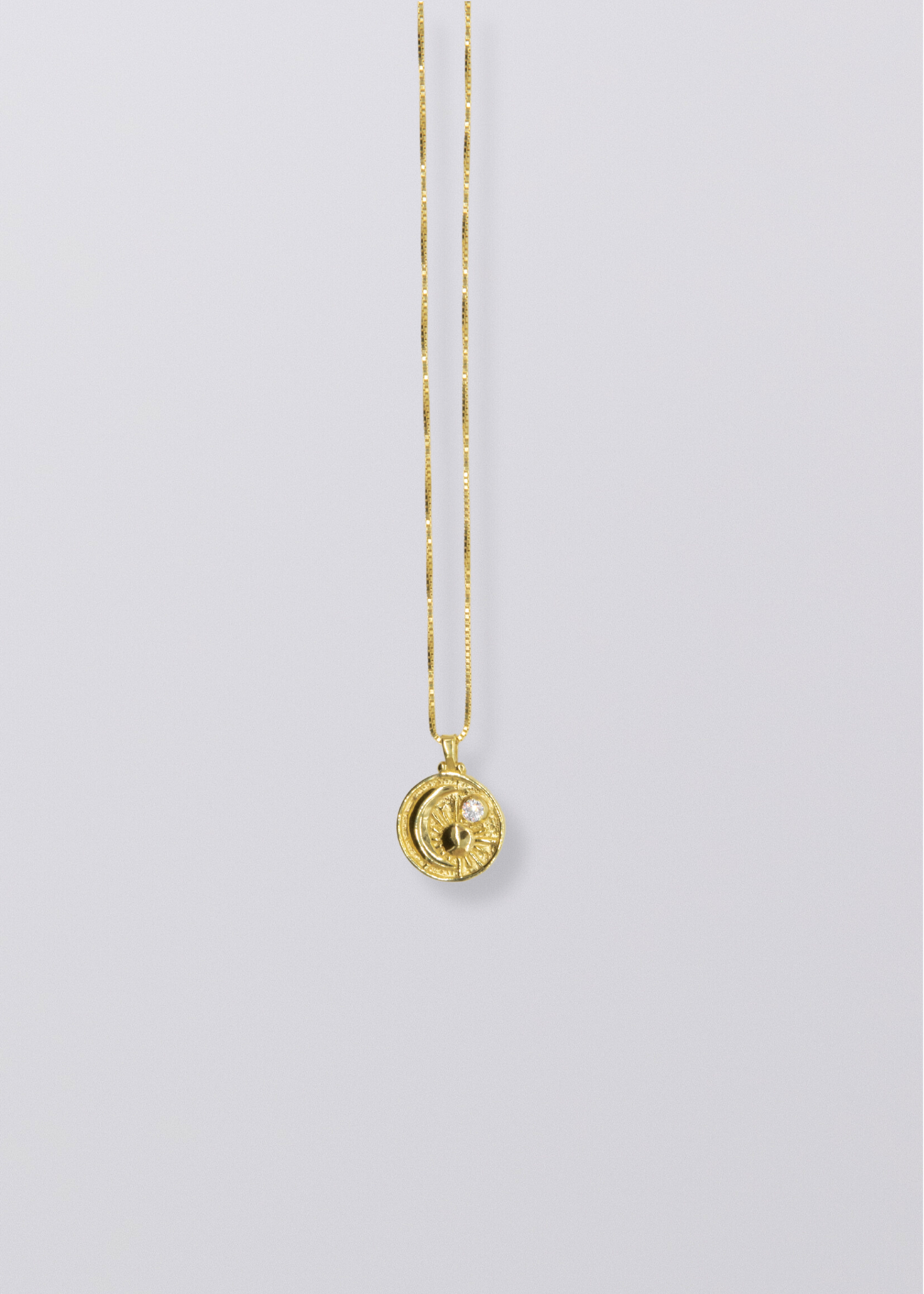 The Selene Necklace is a homage to the interplay of the Moon and the Sun, the necklace features a round pendant showcasing both celestial bodies and a small gemstone. Available in various colours, the stone allows you to personalize this understated piece, suspended on a chic box chain, as a subtle reminder of the perpetual dance between day and night, light and dark - always remember that one cannot exist without the other. With 12 stones to choose from, there is something for everyone.