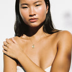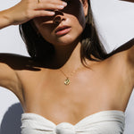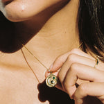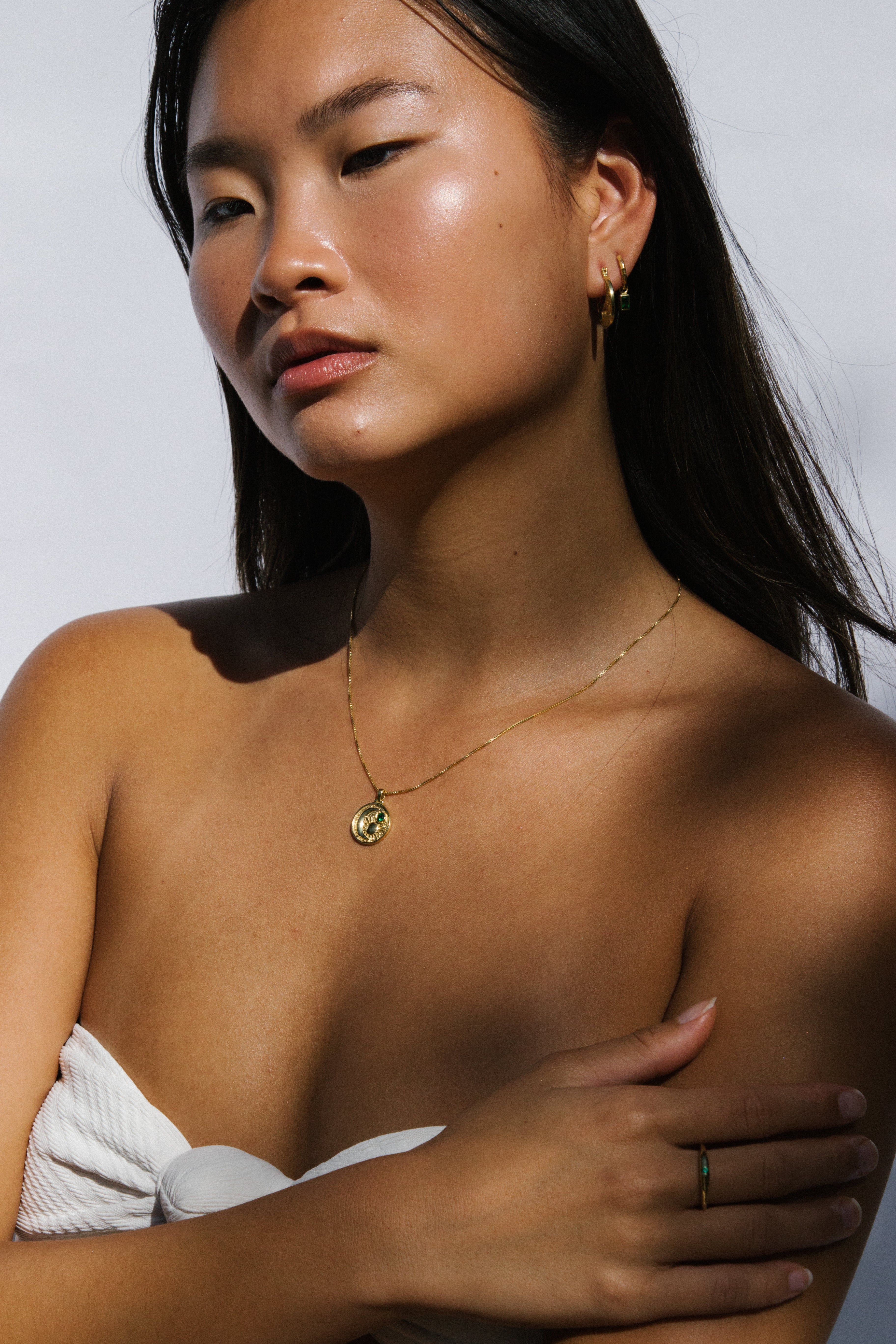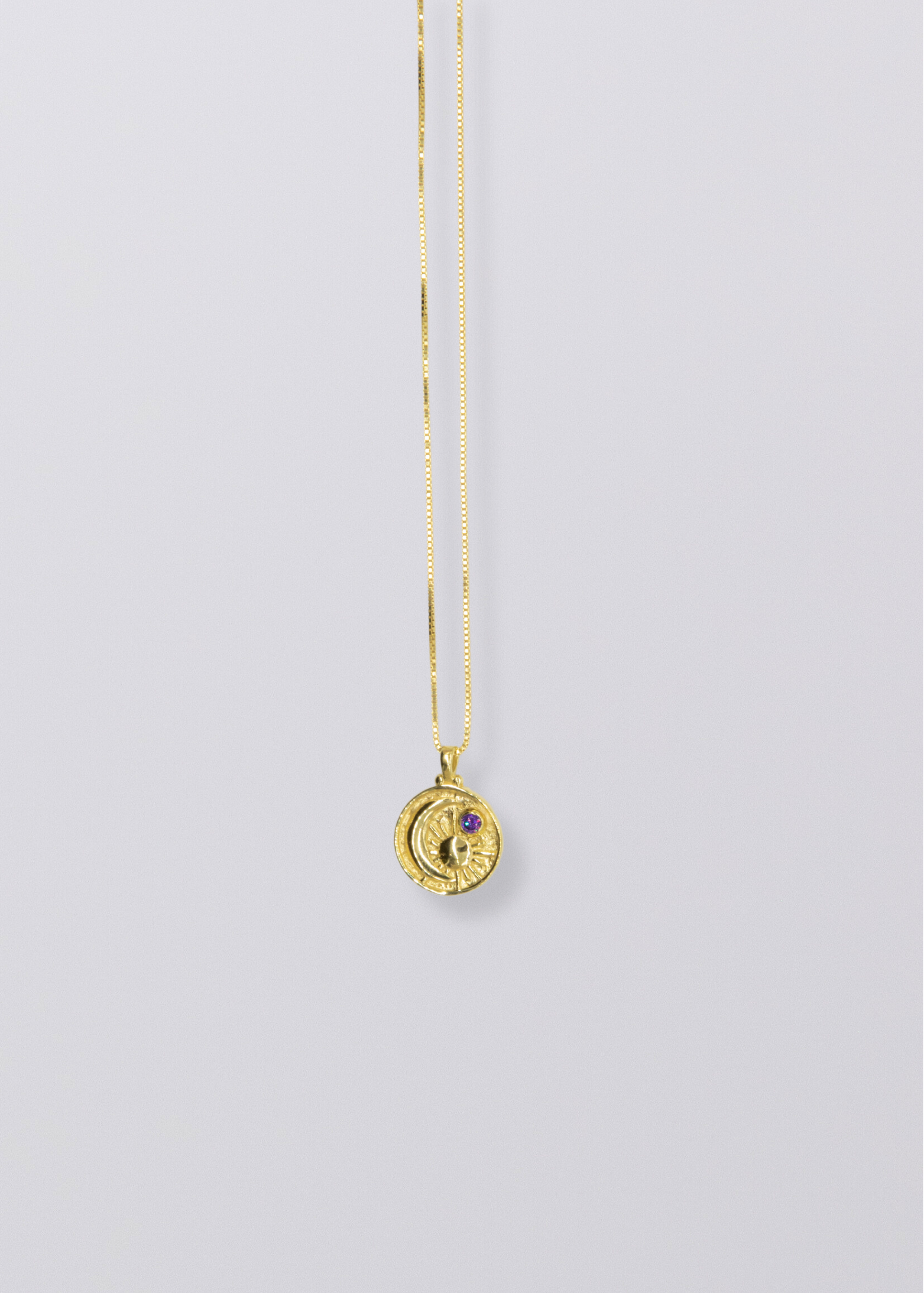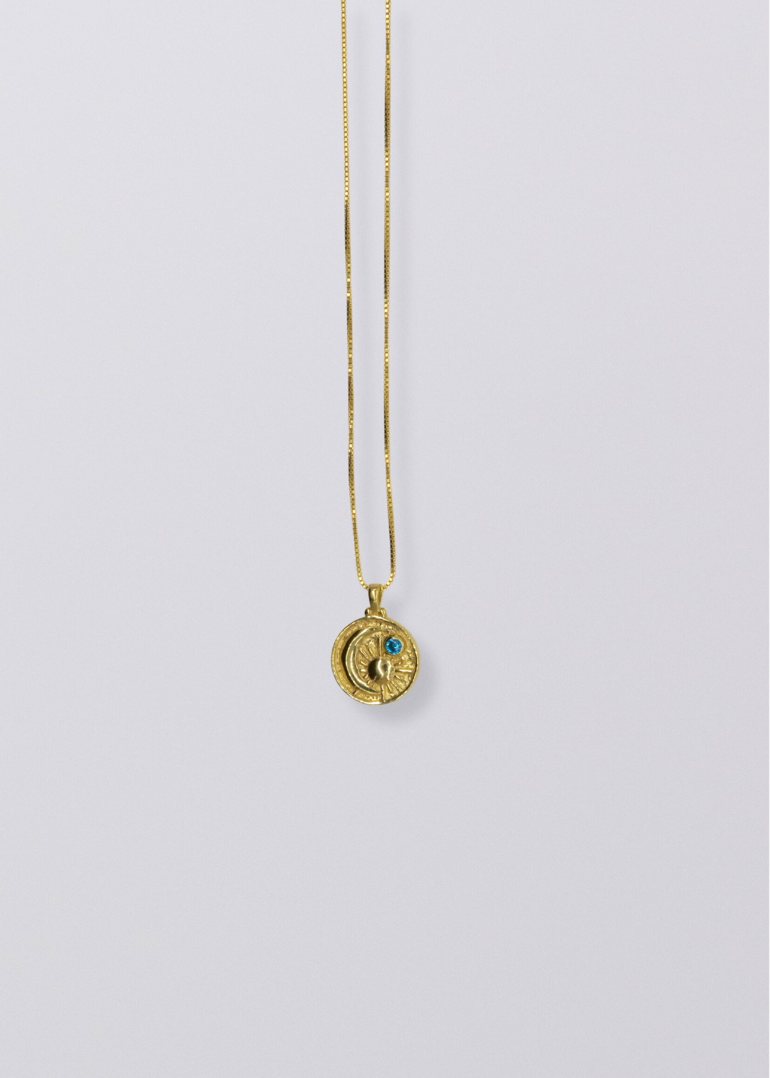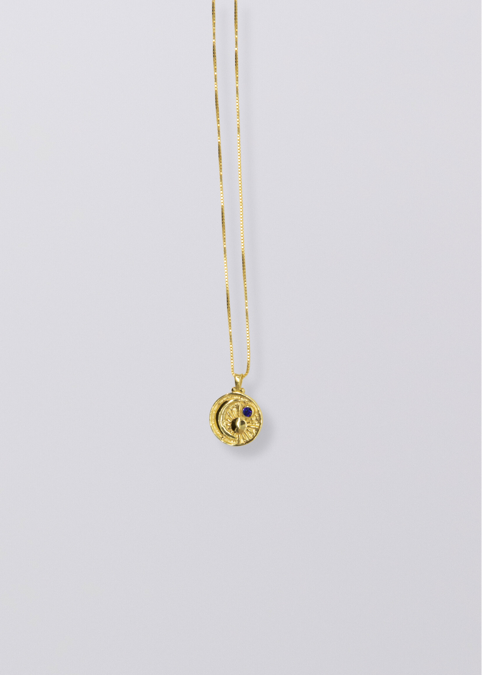 The Selene Necklace is a homage to the interplay of the Moon and the Sun, the necklace features a round pendant showcasing both celestial bodies and a small gemstone. Available in various colours, the stone allows you to personalize this understated piece, suspended on a chic box chain, as a subtle reminder of the perpetual dance between day and night, light and dark - always remember that one cannot exist without the other. With 12 stones to choose from, there is something for everyone.