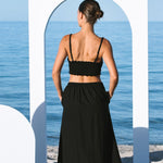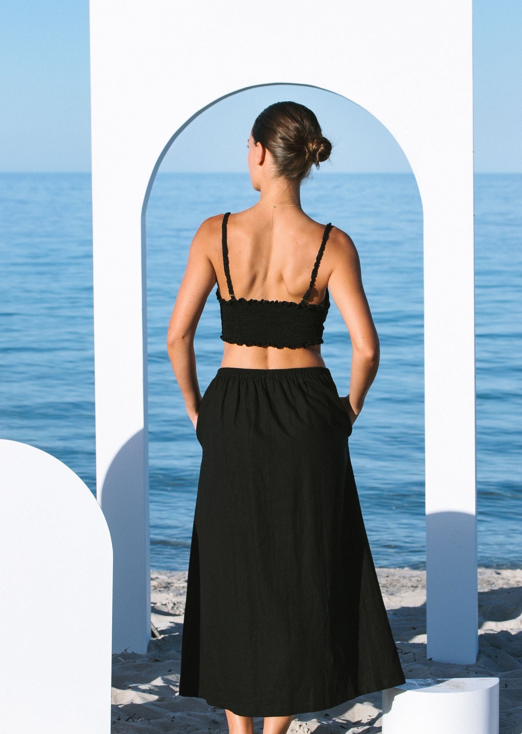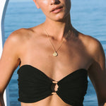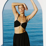 A perfect mix of playful and refined, The Bandeau top is the perfect piece for layering or on its own for the warmer months. It's scalloped curved detail comes into a central rattan ring, giving a gathered look and a flattering fit. Ruching around the back of the top ensures a comfortable well-fitting wear. The Bandeau Top also features removable straps which can be worn in many different variations to give edge to and elevation to the piece. Style this piece with the Split Skirt, Tailored Trousers, Oversized Blazer or Pleat Shorts.