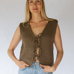 The Tie Vest is a timeless knit piece that blends effortless style with cosy sophistication. Crafted from a soft, textured knit, this sleeveless design features an open front with 3 delicate tie closures, allowing for a customisable fit. Its deep V-neckline and relaxed silhouette make it a versatile layering staple, perfect over a simple tee or worn on its own for a minimalist statement. Available in a muted, earthy palette, the Tie Vest brings warmth and understated elegance to any wardrobe.