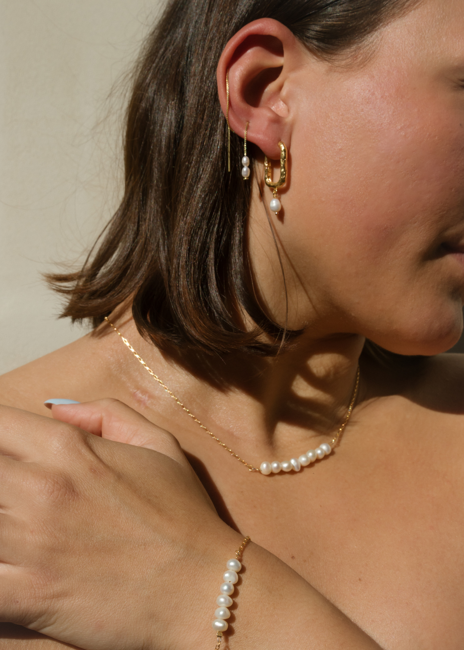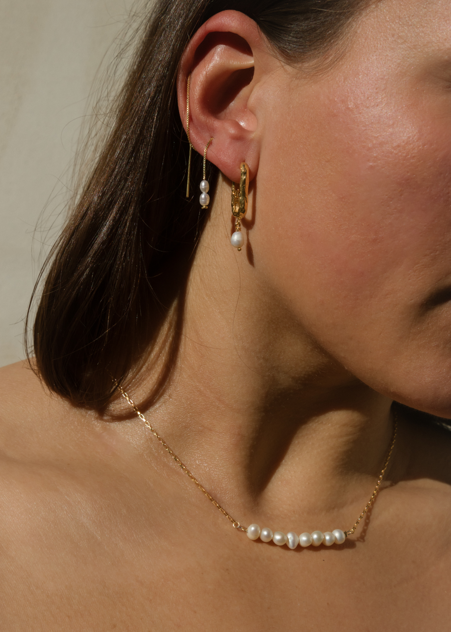 The Mira Necklace is a delicately crafted chain featuring a row of natural pearls that rest along the neckline. Evoking the serene beauty of ocean waves, it captures the effortless grace of nature, each pearl a testament to the ocean’s transforming power, shaped into timeless elegance. With a touch of vintage inspiration, this is the modern take of your string of pearls for everyday simplicity.