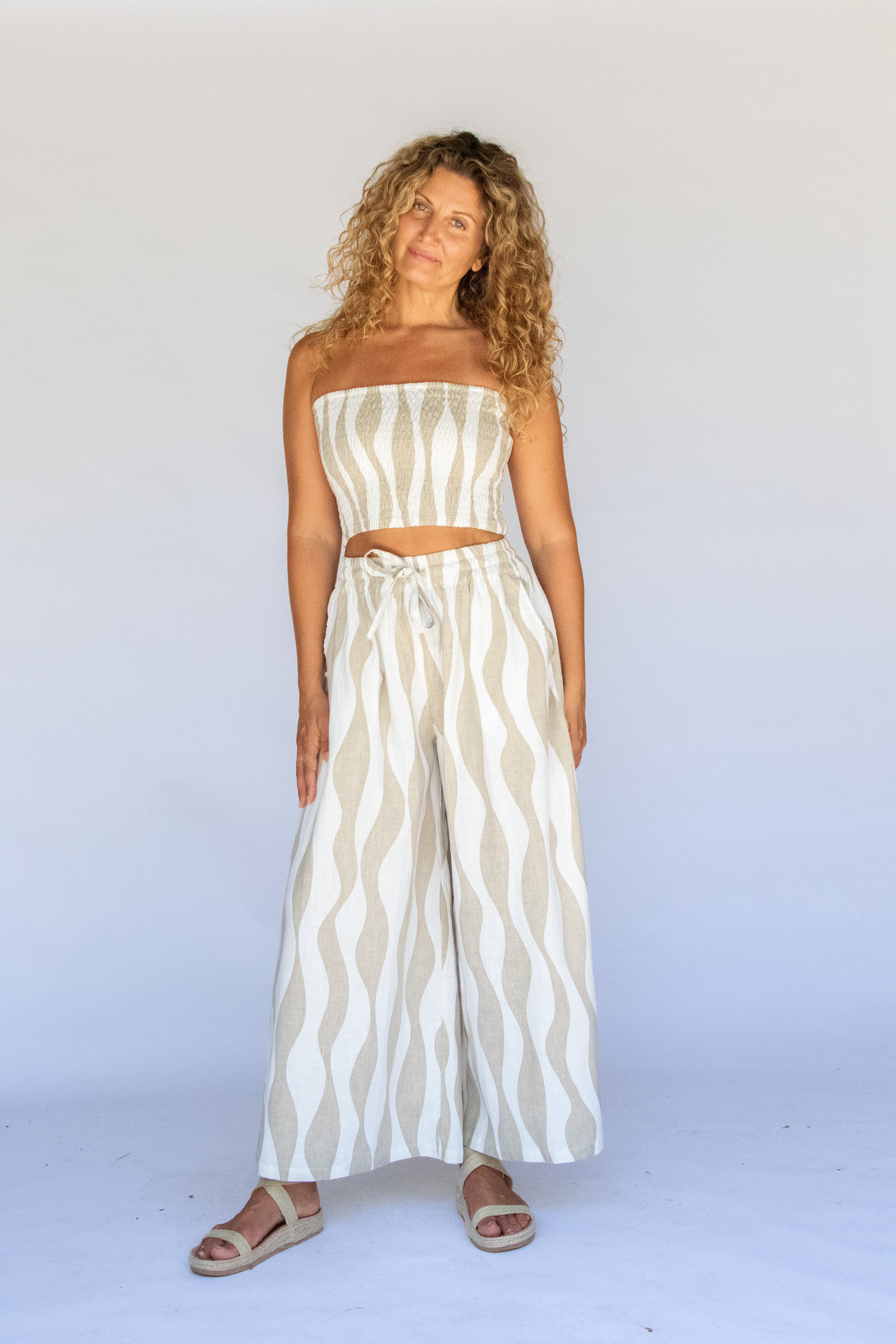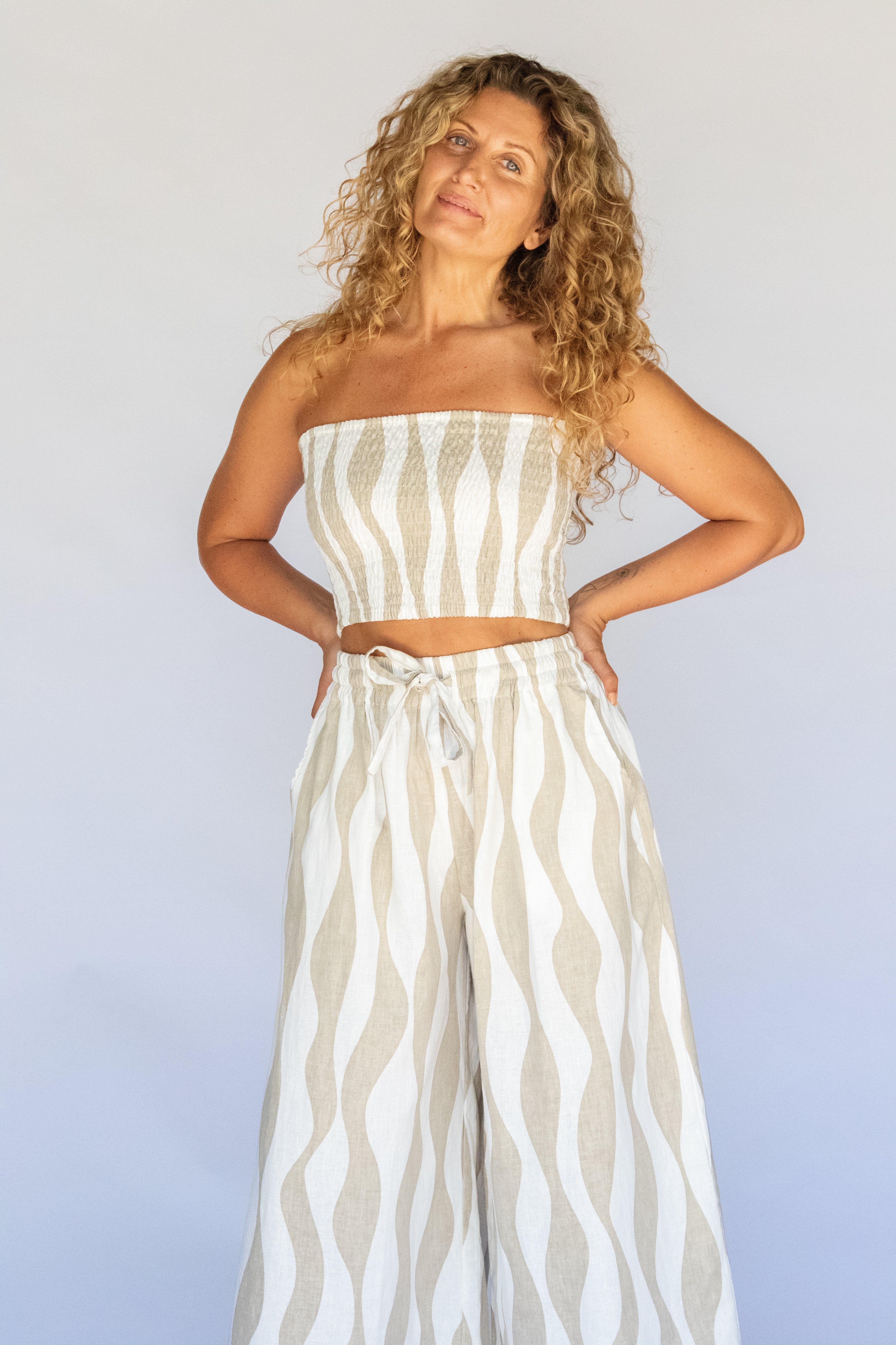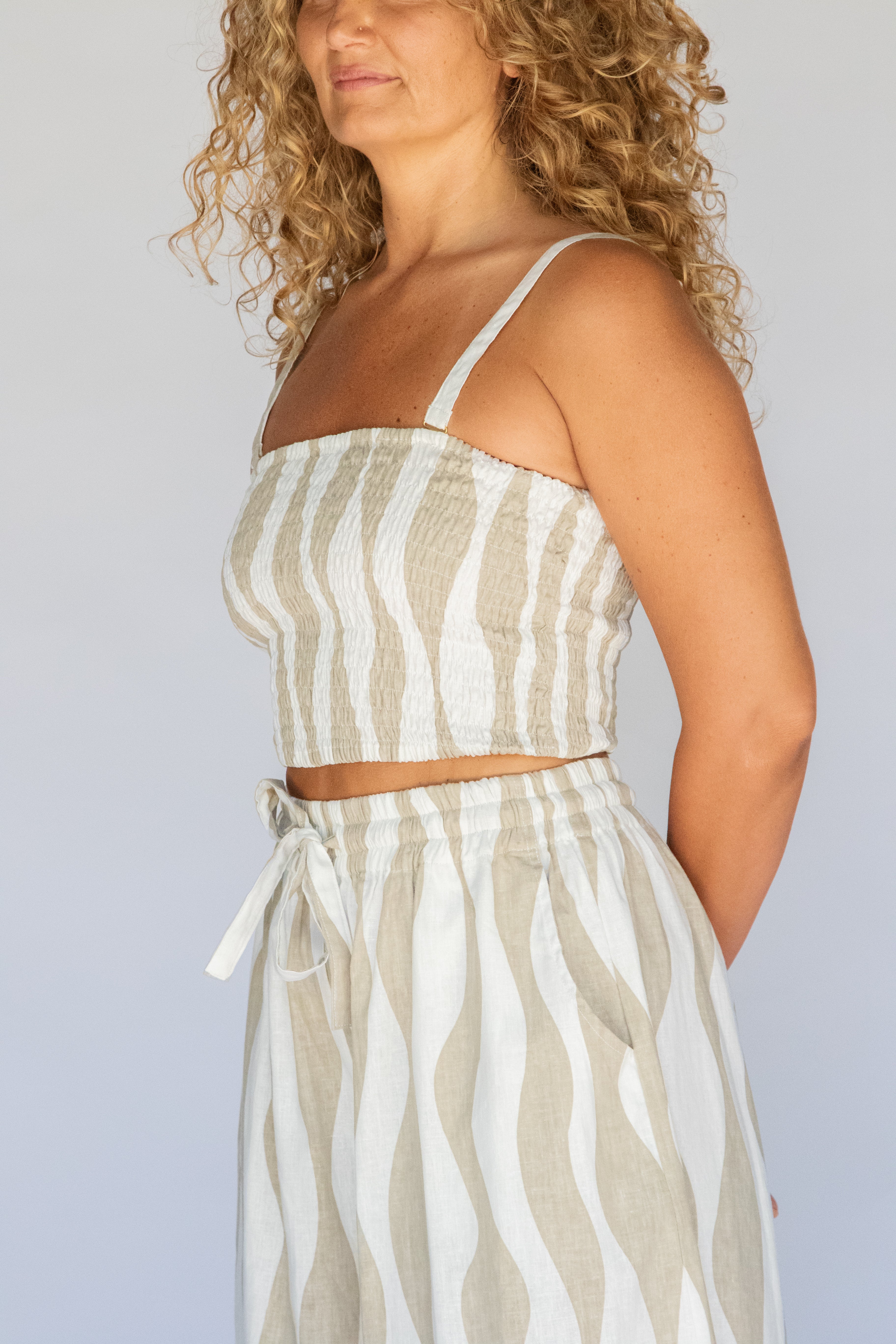 Introducing the Margot Top – your perfect companion for sun-drenched coastal adventures. Effortlessly chic and inspired by serene seaside escapes, it features a flattering shirred design crafted from soft, breathable fabric. Ideal for breezy beach days and sunset strolls, its versatile bandeau cut pairs perfectly with high-waisted shorts, a flowy skirt or our Margot Pant.