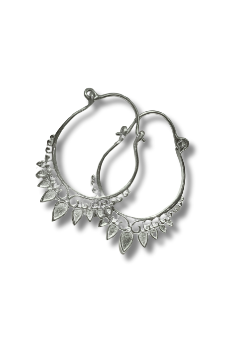 Featuring filigree detailing on medium sized silver hoops, these beauties are easy for everyday wear or to add the finishing touch for a special occasion.