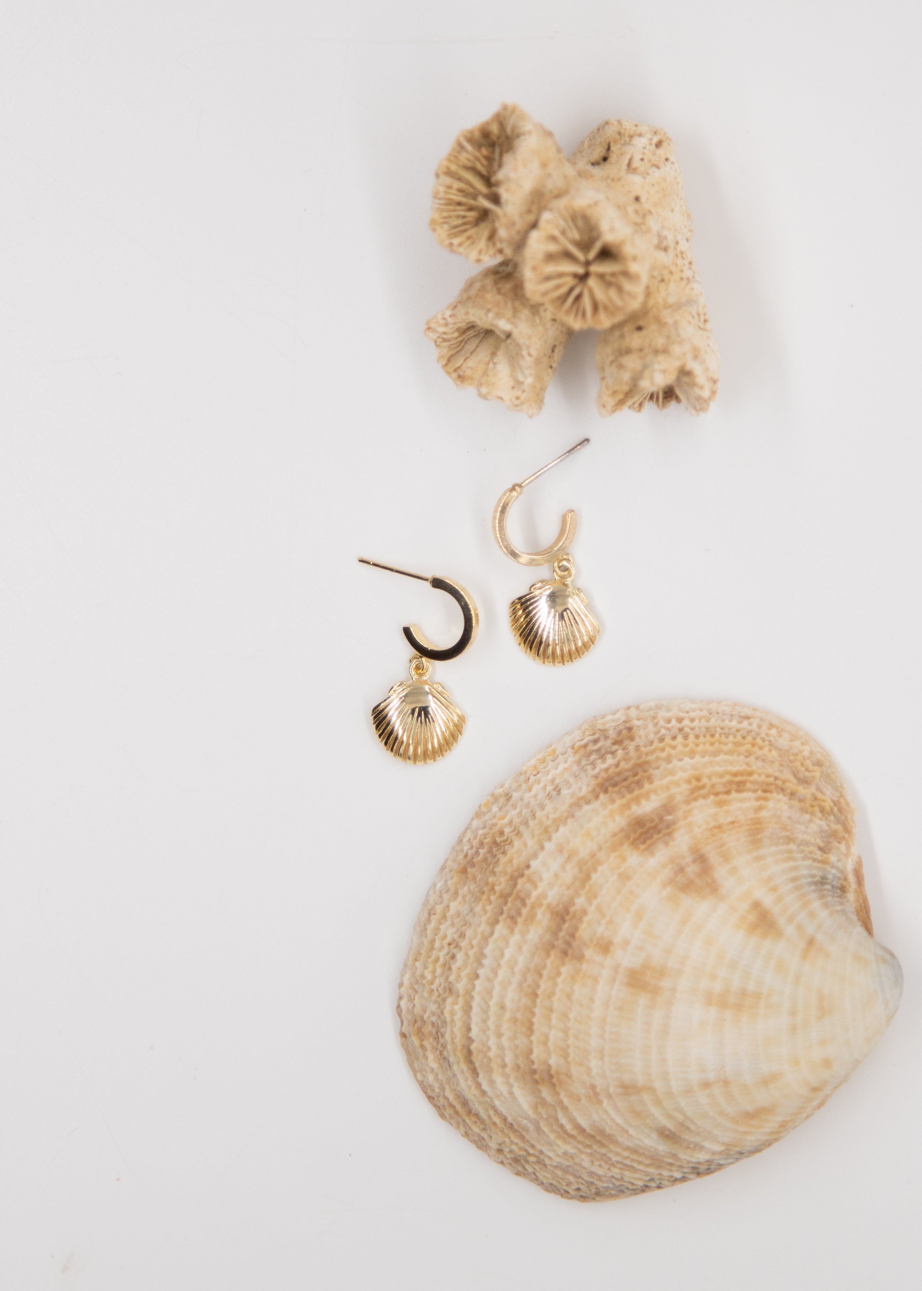 Shell Hoop Earrings feature a clam like shell drop from a small/med size hoop.