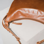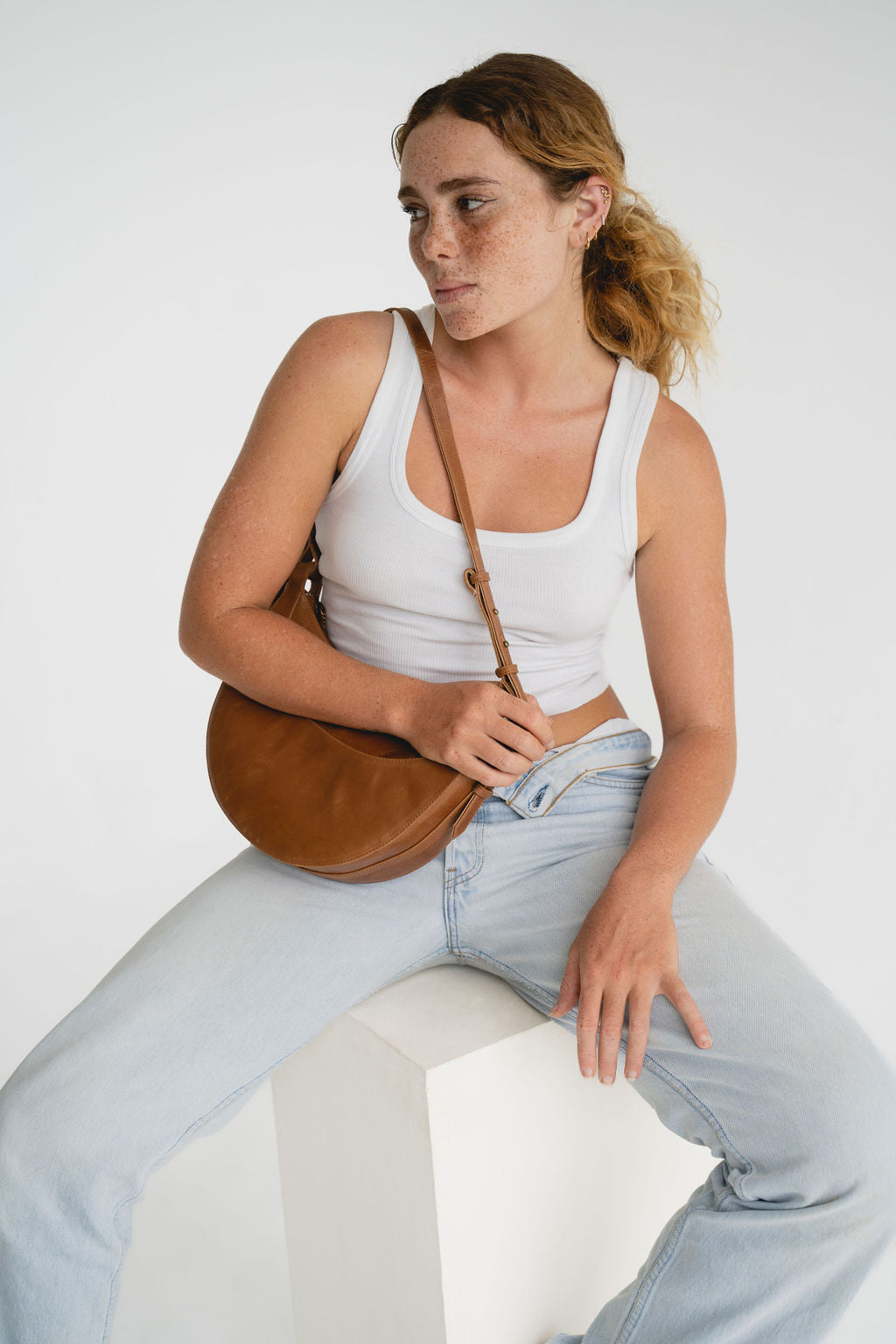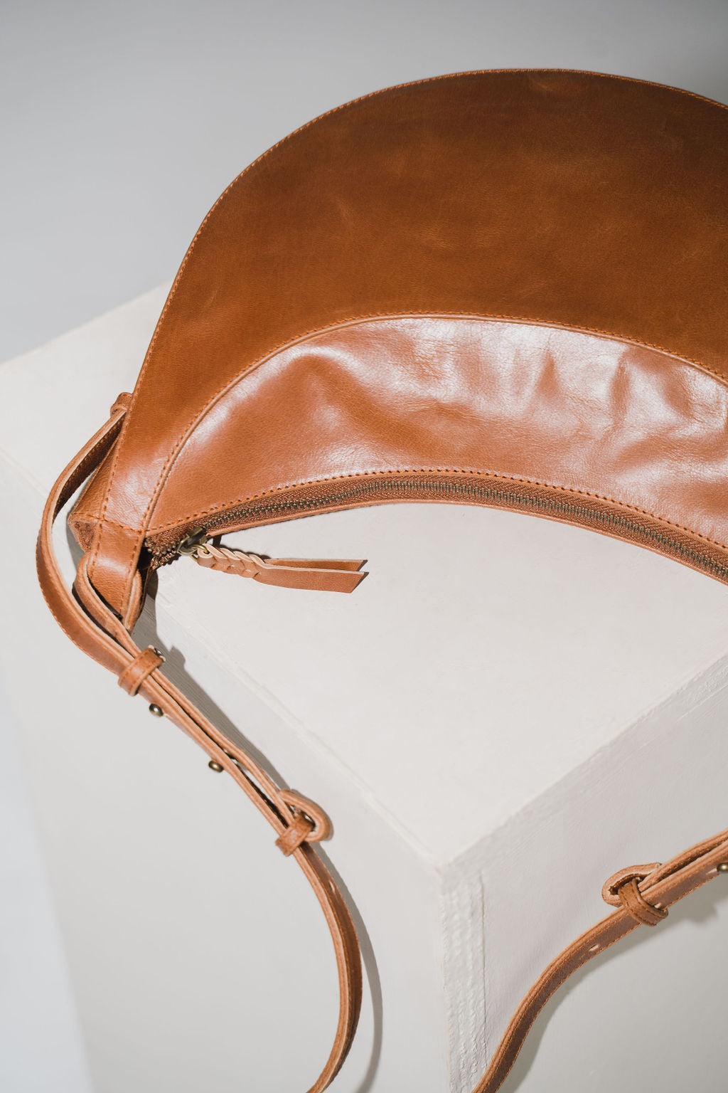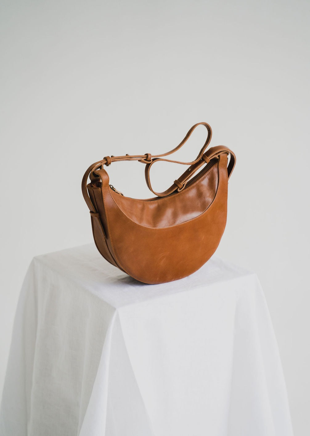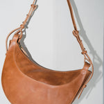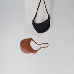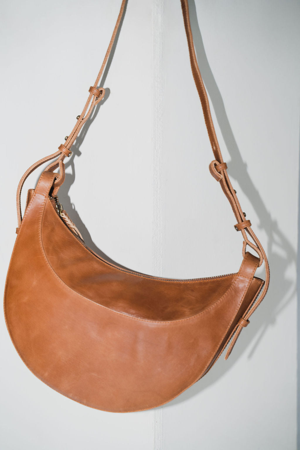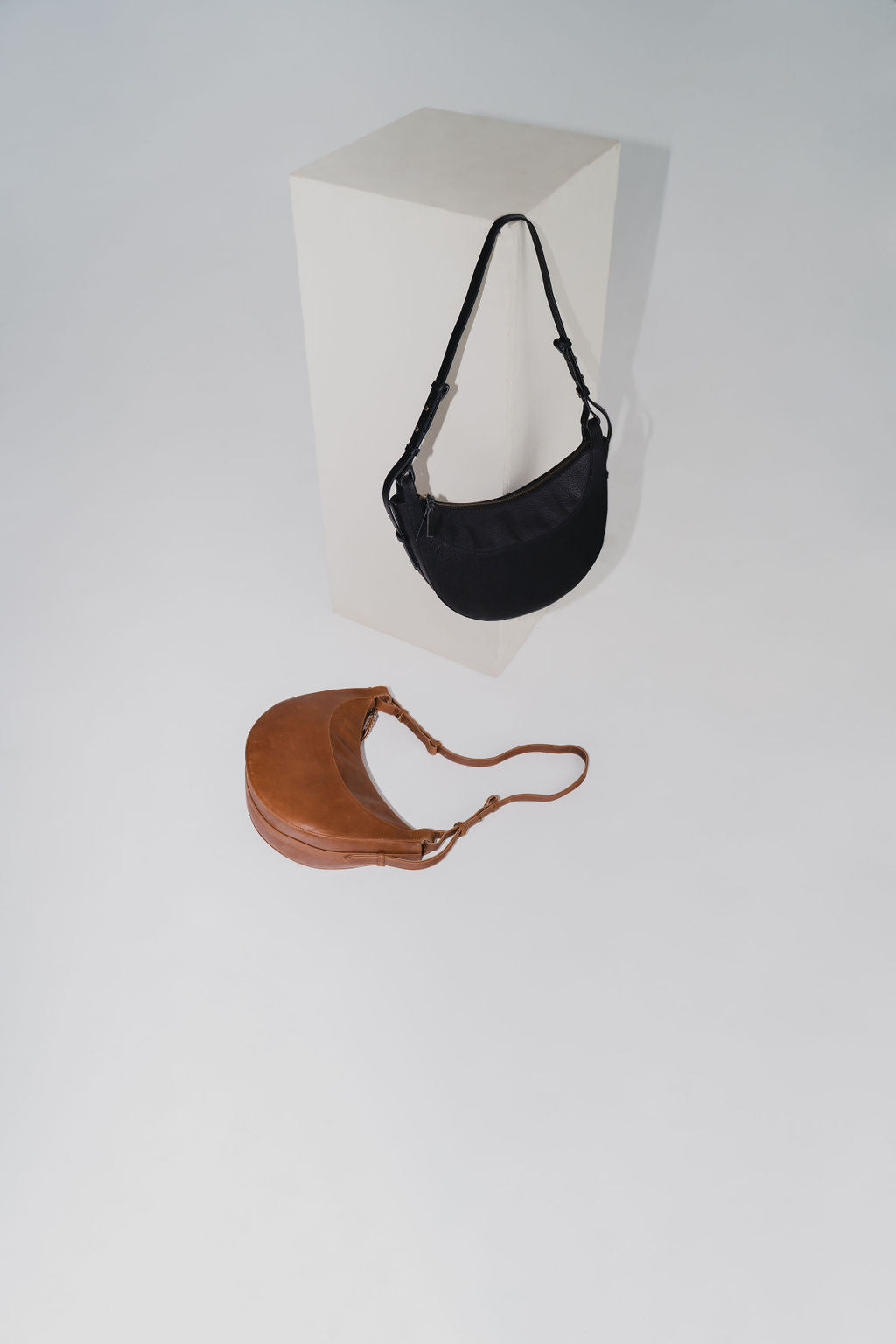 The namesake of the collection, the Pelle Bag is elevated and stylish. Resembling a half moon shape with panelling on either side.
