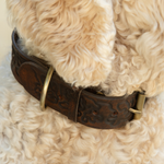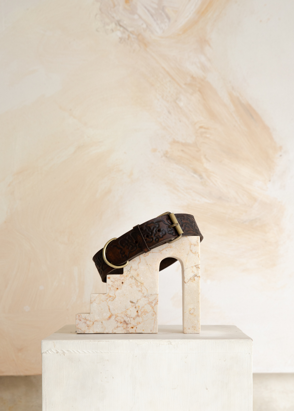 Beautifully hand-tooled for your furry companion. The Sumba Collar features signature detailing, brass hardware, and five adjustable eyelets for the perfect fit.